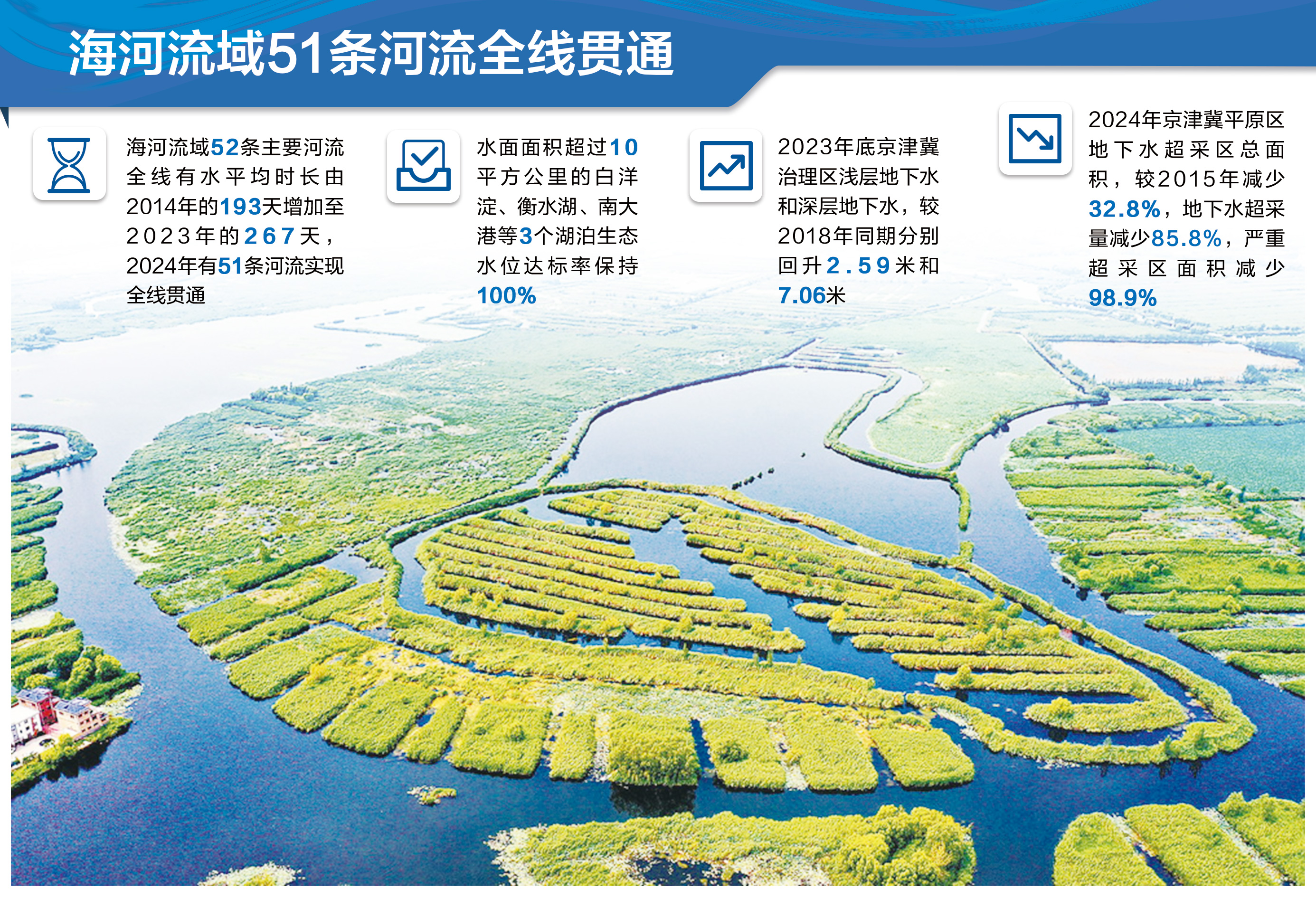 数据显示,海河流域52条主要河流全线有水平均时长由2014年的193天增加至2023年的267天,有水长度占评估河长比例由2014年的75%增加至2024年的96%,2024年有51条河流实现全线贯通。