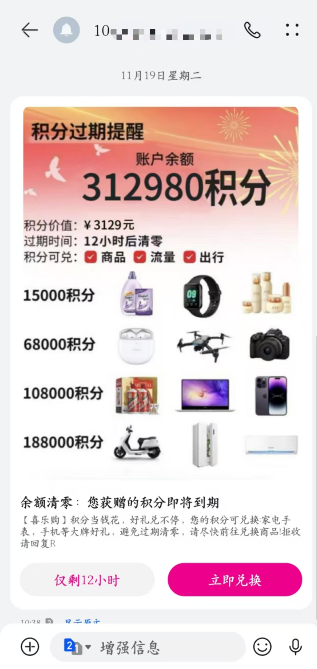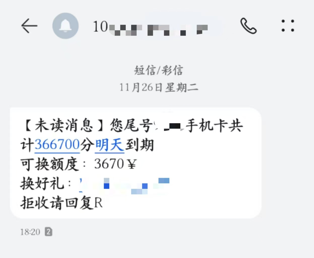 “紧急通知,您尾号XXXX手机卡共计366700积分今天到期,价值3670元,可换好礼……”临近年底,不少市民都频繁收到这样的短信,结尾还常带有换礼品的链接。对此运营商提醒,来自陌生号码的短信切勿轻易点开。