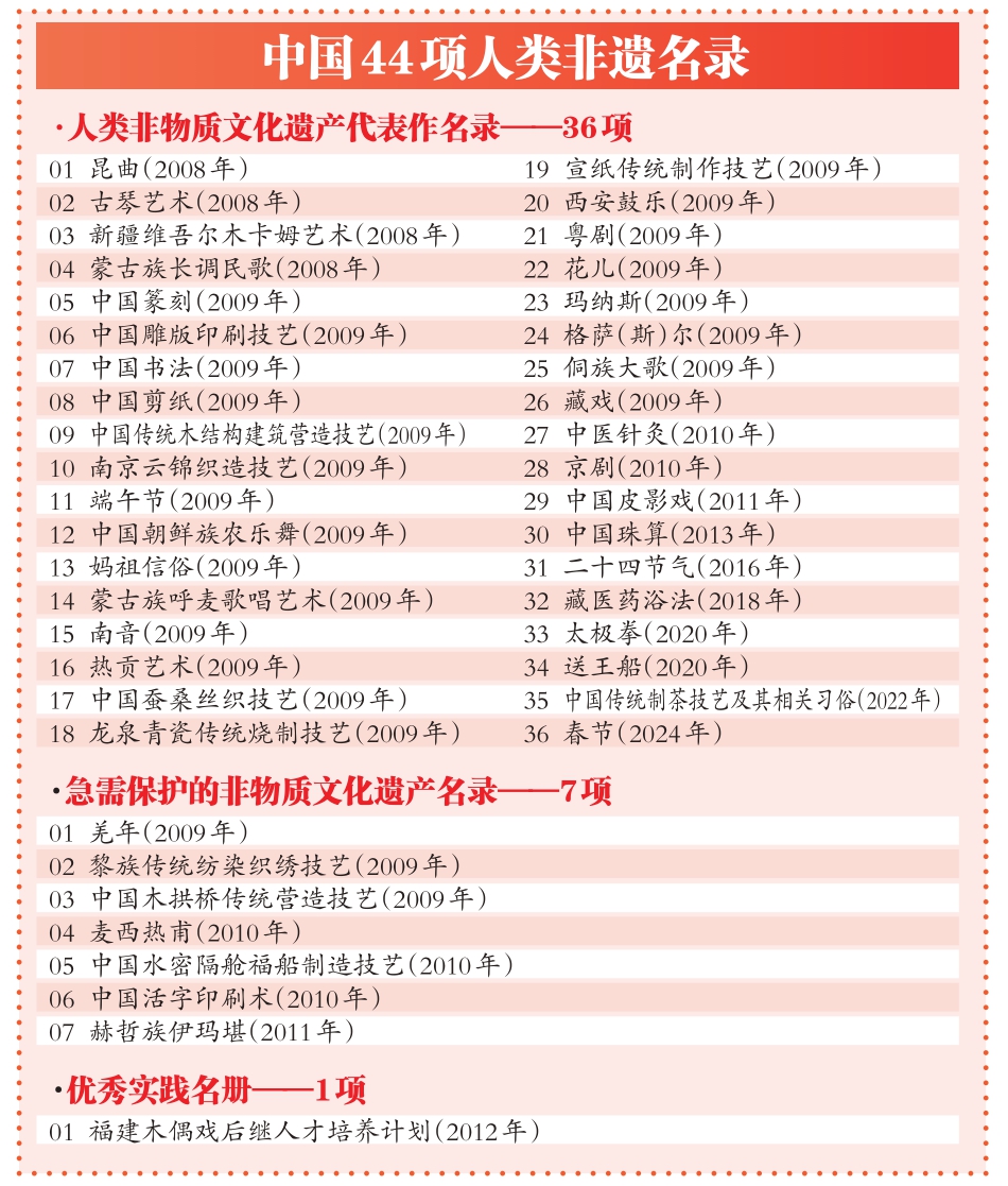 昨天,在巴拉圭亚松森举行的联合国教科文组织保护非物质文化遗产政府间委员会第19届常会上,中国申报的“春节”通过评审,列入联合国教科文组织人类非物质文化遗产代表作名录。至此,中国共有44个项目列入联合国教科文组织非物质文化遗产名录、名册,总数居世界第一。