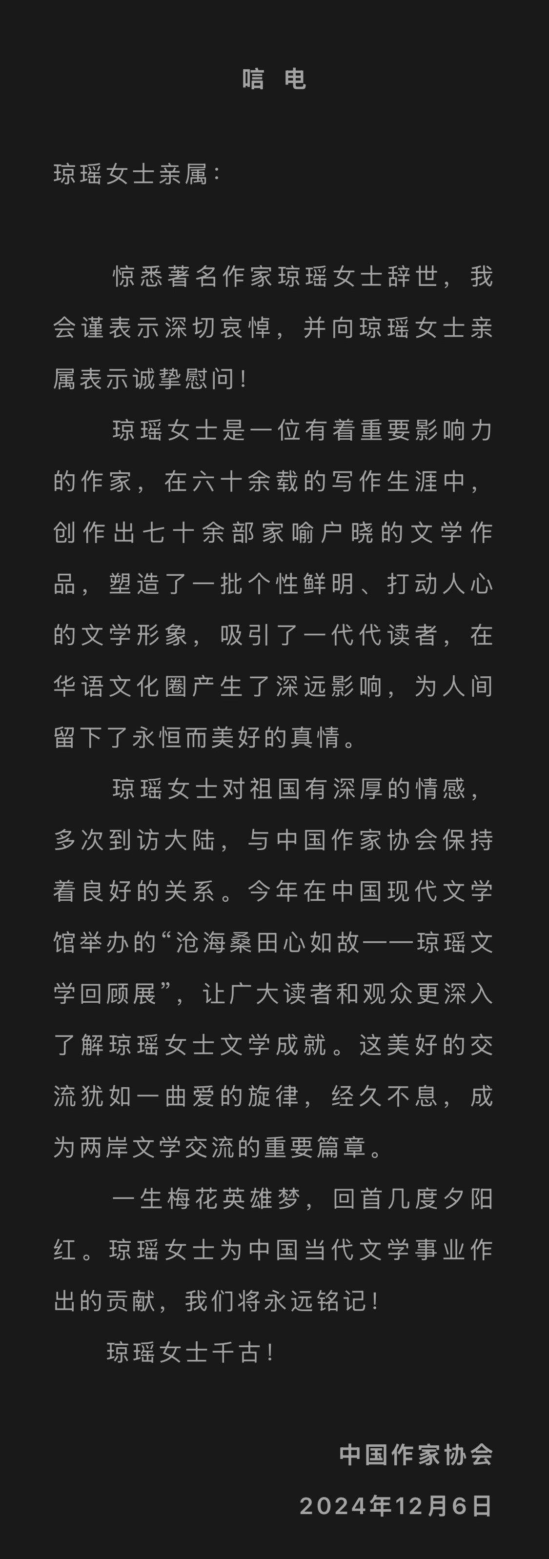 12月4日,中国台湾著名作家琼瑶在家中去世,终年86岁。12月6日,中国作家协会向琼瑶女士亲属致唁电,对琼瑶女士去世表示哀悼,并向其亲属表示慰问。