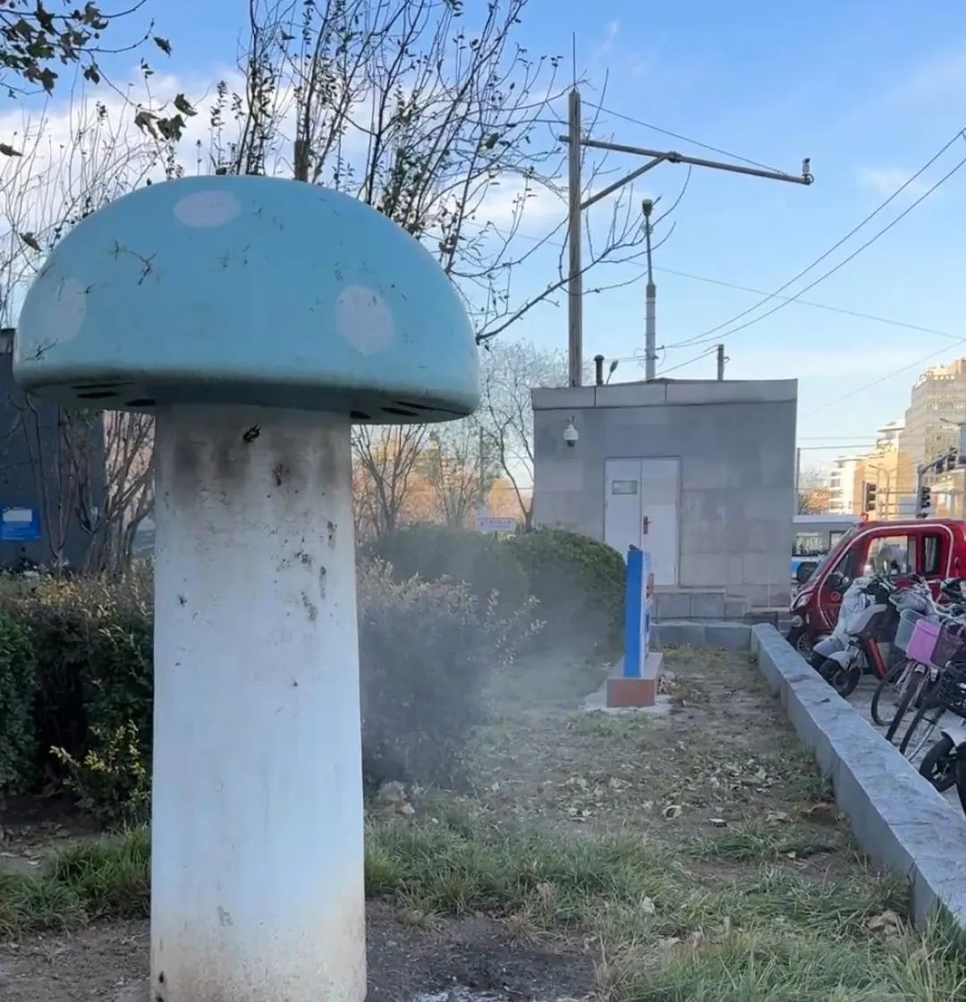 这些“蘑菇” 一般“长”在人行道旁的绿化带里,一米到两米高,一到冬天,就会喷出白色雾气。 其伞盖大多是蓝绿色,上面有白色的圆斑,造型既复古又童趣。“好像小时候见过,有网友称这种不真实的感受为“中式梦核”感。