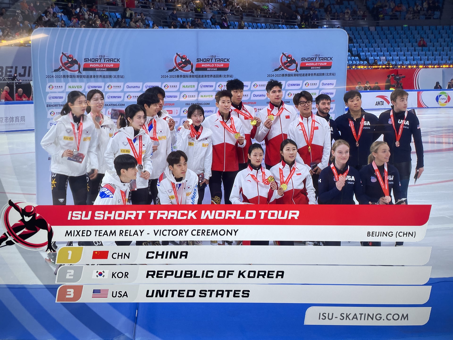 12月8日,2024-2025赛季国际滑联短道速滑世界巡回赛(北京站)展开最后一日争夺。在混合团体接力A组决赛中,中国队员发挥出色,再夺一金。