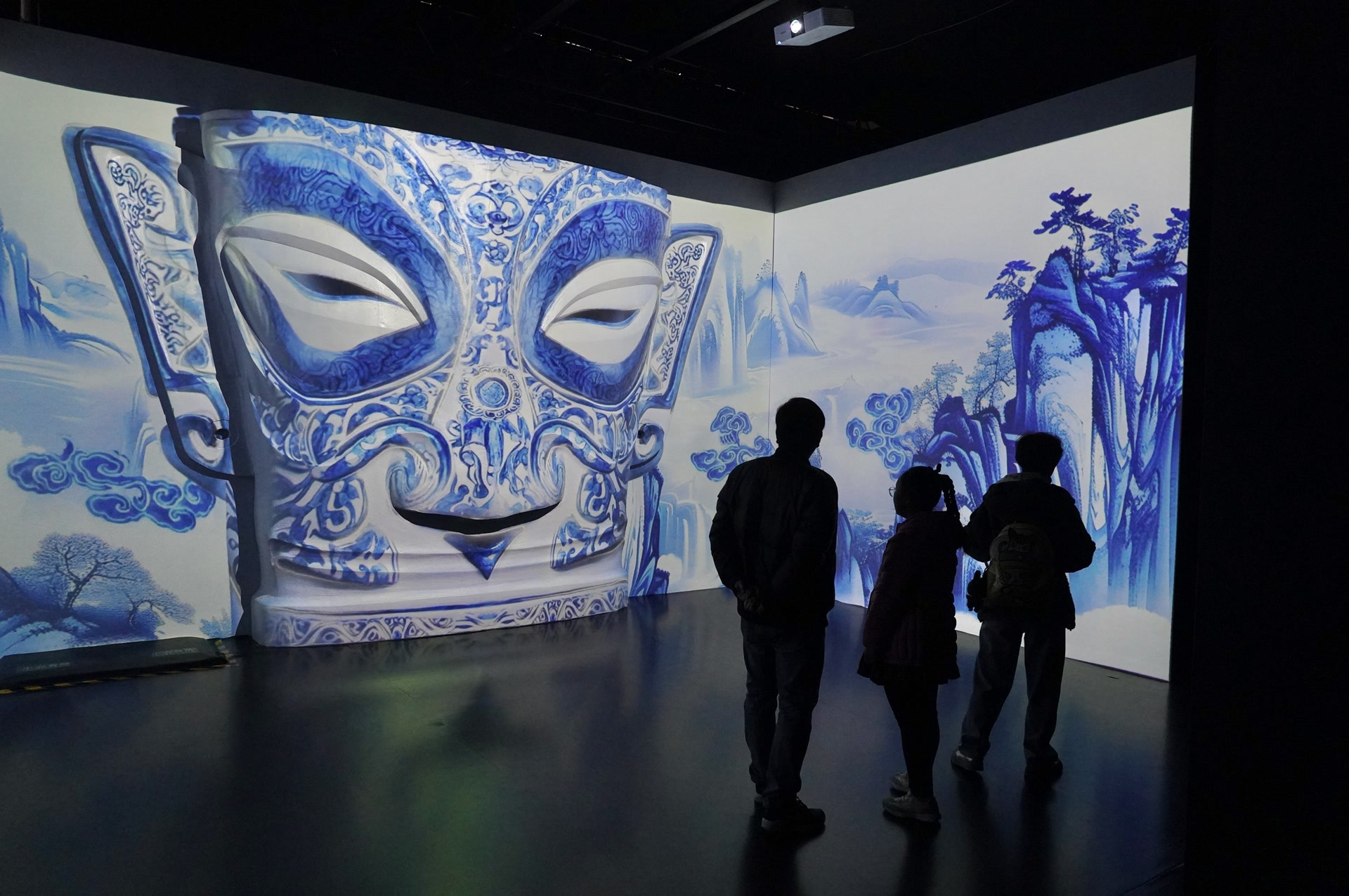 沉浸式数字艺术空间里,青铜立人像摇曳生姿,邀请观众共舞;观众走近驻足点,商青铜太阳形器等文物细节一一展现。观众还可以体会三星堆面具与青花瓷、赛博朋克、乐高像素等不同艺术风格跨界融合带来的惊喜。展览特别为小观众打造了研学区,让他们可以体验三星堆祭祀坑考古发掘、尝试智能绘画、学习古法制玉等。
