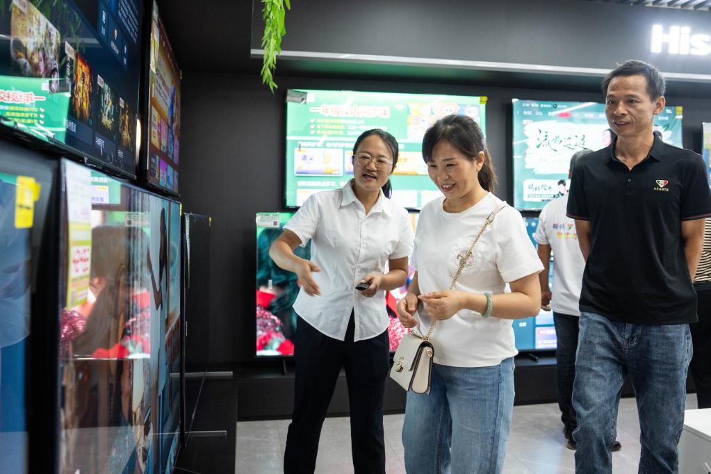 9月24日,彭坤(右一)和妻子彭建华(中)在汨罗市天虹电器城挑选电视。