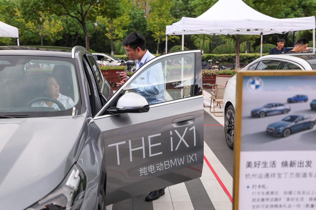 9月27日,经销商(右)在“美好生活 焕新出发”消费品以旧换新展会现场向消费者介绍车辆。(新华社记者 江汉 摄)