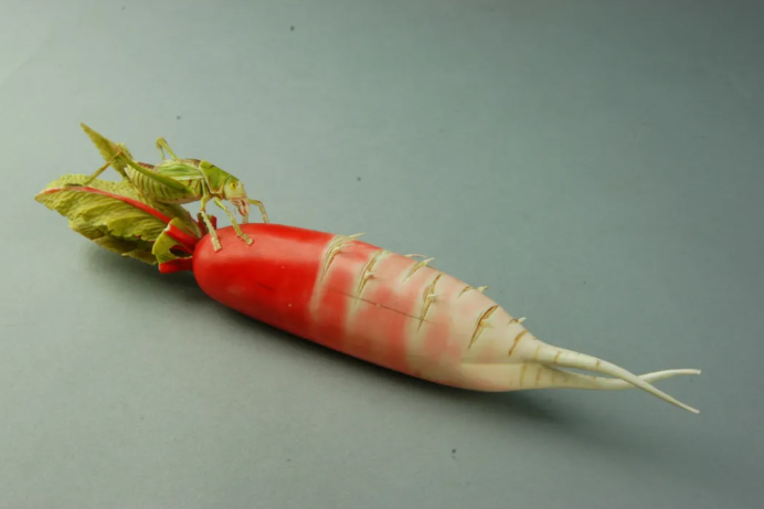 这根“萝卜”长约27厘米,重229克。根茎由上部的红色渐变为中部的粉红和根部的白色,根须自然弯曲,叶片呈绿色。萝卜上一只蝈蝈伸出前肢正由叶片爬向茎部,也显得动感十足。