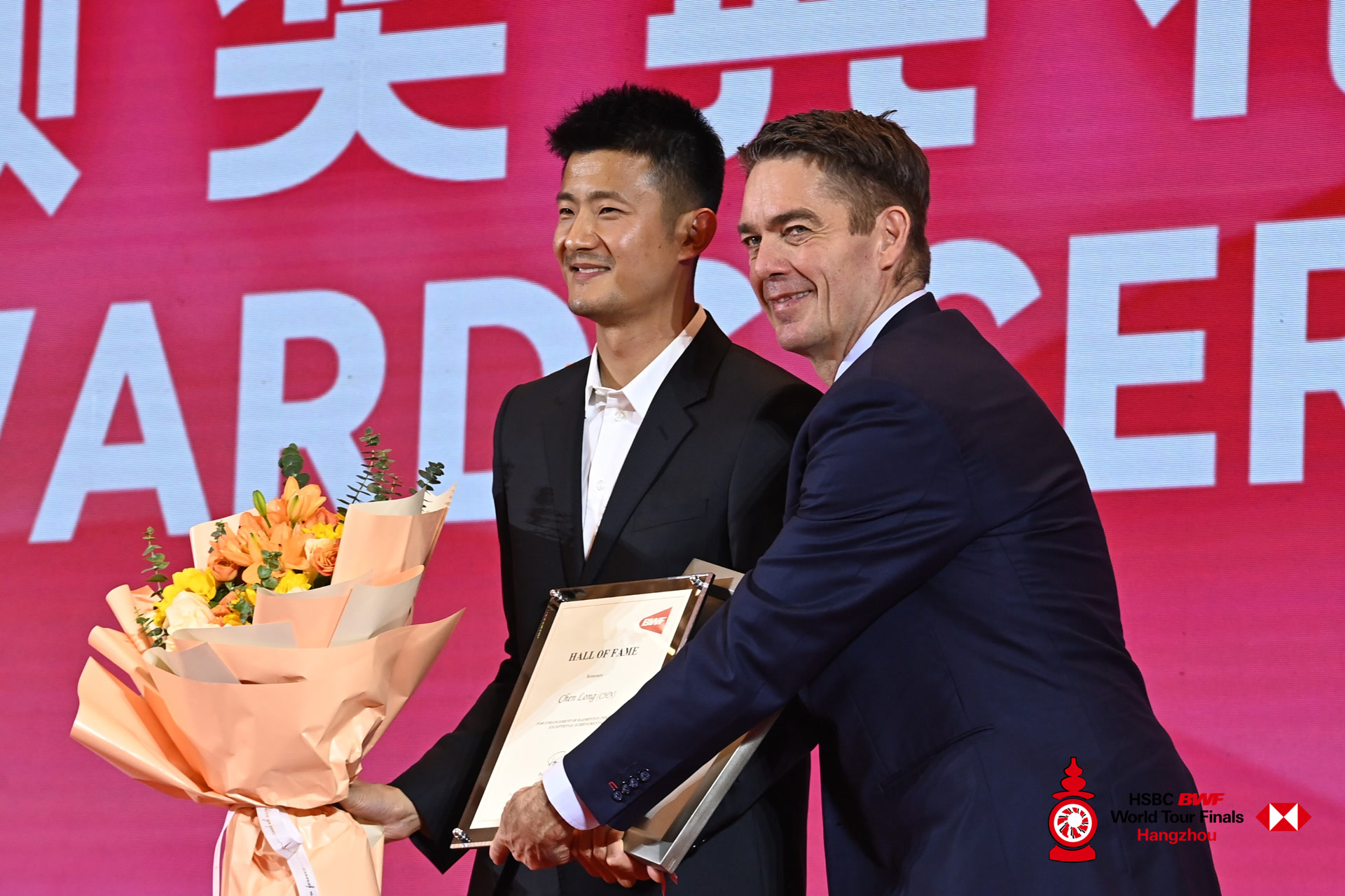 典礼还举行了今年的名人堂入选仪式,两位奥运冠军谌龙、李龙大正式进入世界羽联名人堂。