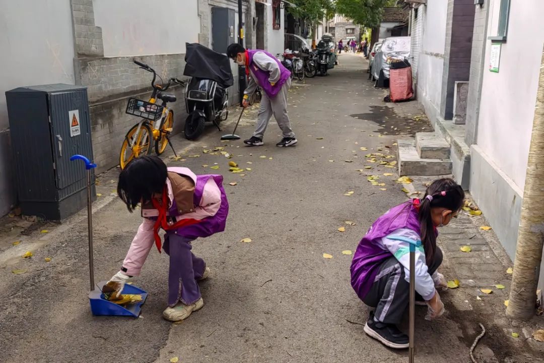 在国子监社区,甜葡萄志愿服务队的20名青少年志愿者利用周末时间,和爸爸、妈妈一起走进国学胡同,清扫落叶、捡拾垃圾。