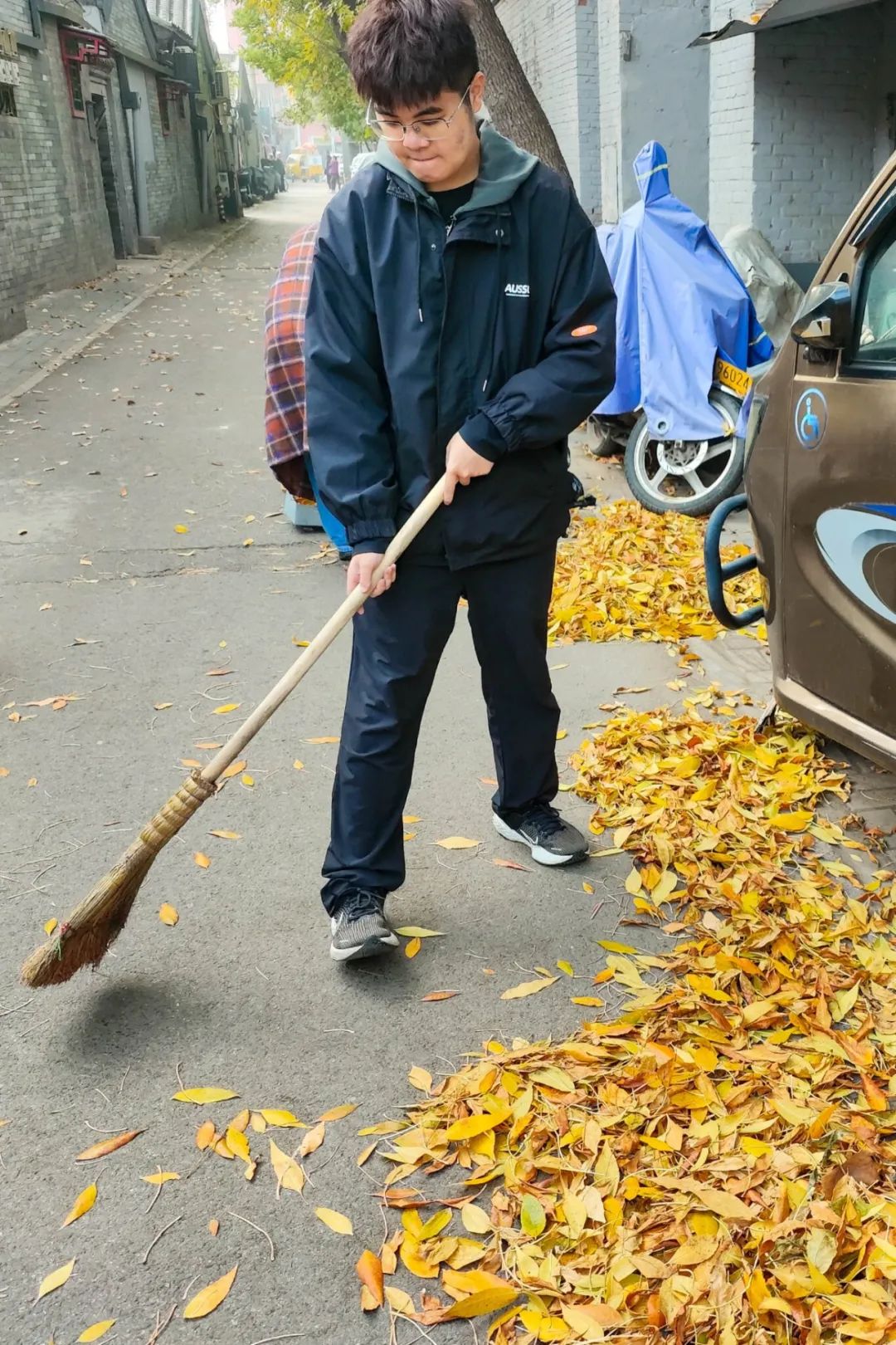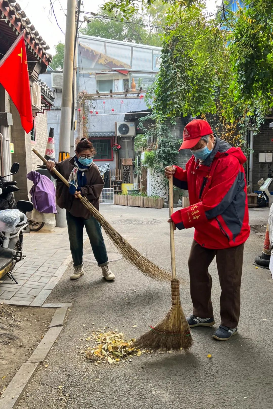 老党员志愿者和社区工作者们在清扫落叶的同时,还对胡同内的小广告进行了集中铲除。原本满是枯叶的道路,经过大家的共同努力,路面重新露出了整洁的模样。