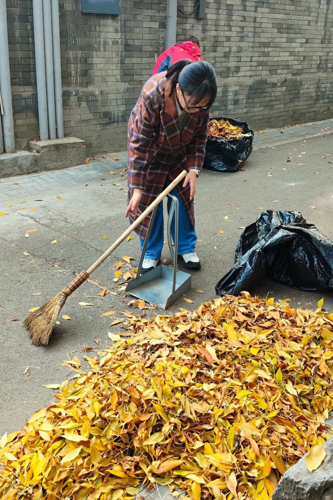 在分司厅社区,志愿者们手持扫帚、簸箕、小铲子,配合默契。青少年志愿者们将胡同内的落叶分段包片扫成一堆,为消除安全隐患,落叶在集中装袋前,还对落叶进行了洒水处理。