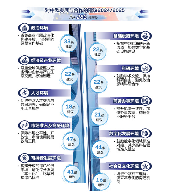 报告基于为期四个月、对约200家在欧中企进行的问卷调查及深度访谈。报告中,在欧中企呼吁欧盟尊重全球产业链供应链分工,审慎使用经贸工具和贸易救济手段,避免“经济安全”政策泛化。报告指出,中欧即将于2025年迎来建交50周年,商业界期待双方共同反对“逆全球化”趋势和“新兴保护主义”,促进经贸及双边关系健康发展,助力全球贸易投资增长。报告还就欧盟营商环境的改善和促进中欧发展的合作提出283条具体建议。