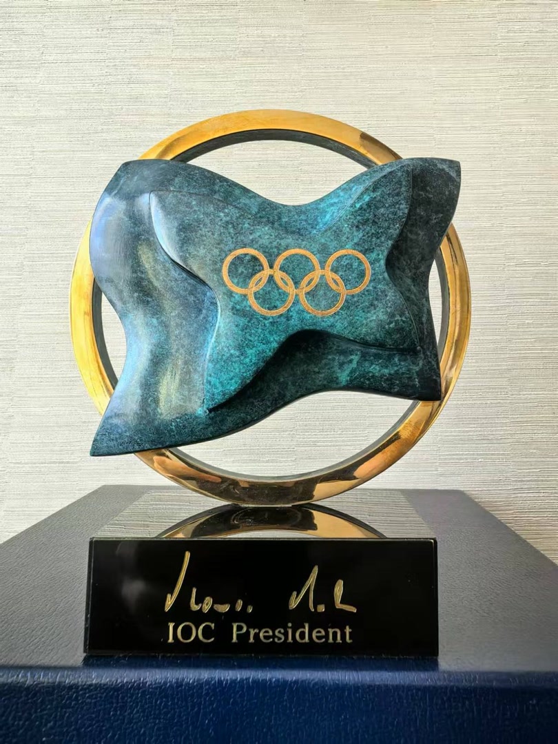 颁发给李全海的国际奥委会主席奖杯,采用太阳能电池板打造,设计融合了鸽子与五环元素。如果从空中俯瞰国际奥委会总部大楼,会发现其屋顶亦采用了这一相同的象征性设计。巴赫强调,“这种设计彰显了国际奥委会对于可持续发展的坚定承诺,鸽子作为和平的象征,指引着我们。而可持续发展的理念也与世界帆联所共同秉持的价值观完美契合。”