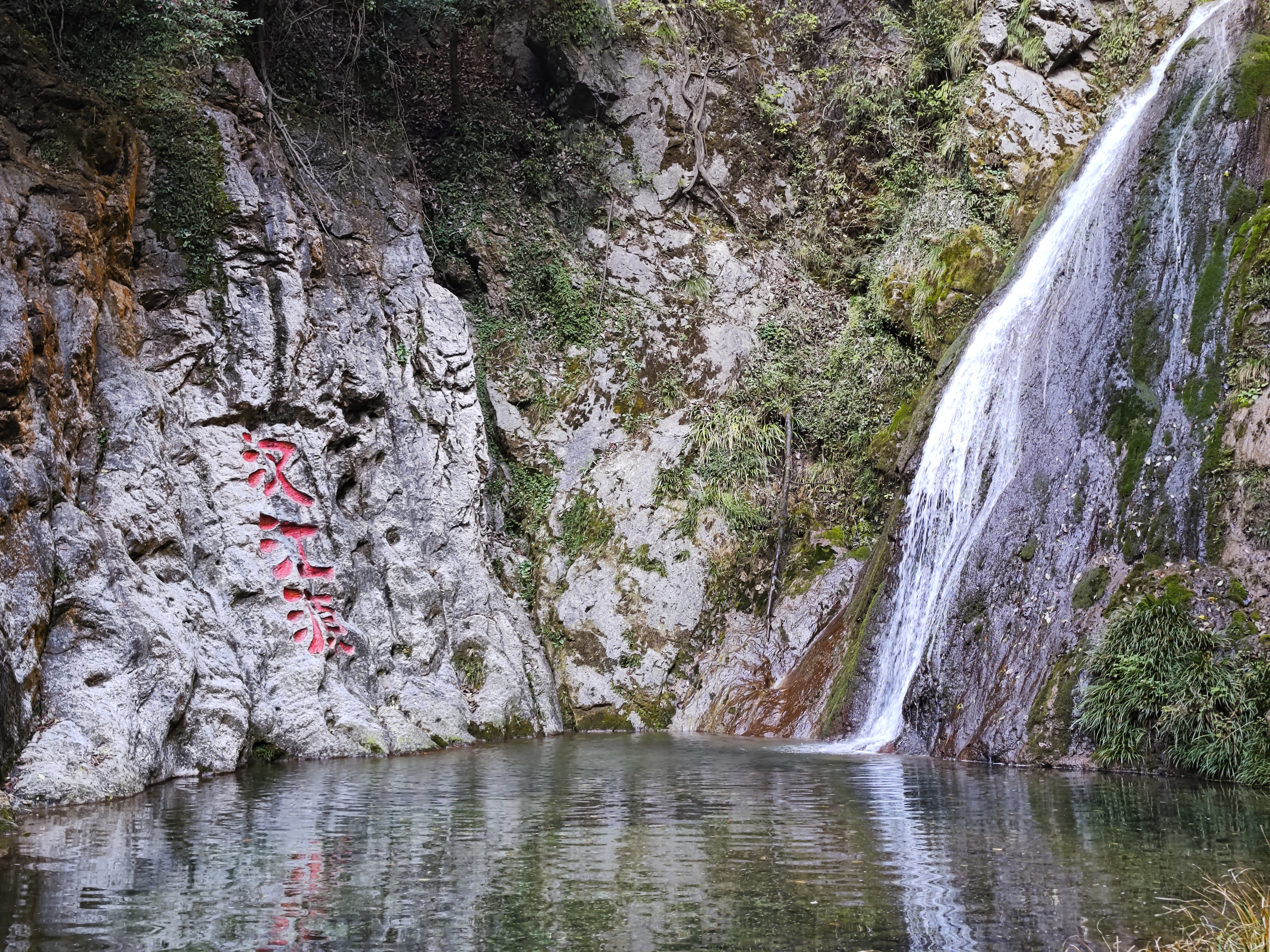 崖壁一侧挂着一股澄澈的小瀑布。一泓清水如玉带般泻下,在崖壁前聚成一汪潭水。微风吹皱如镜的潭面,潺潺之水奔向远方,翻越崇山峻岭,流入京津等地千家万户。