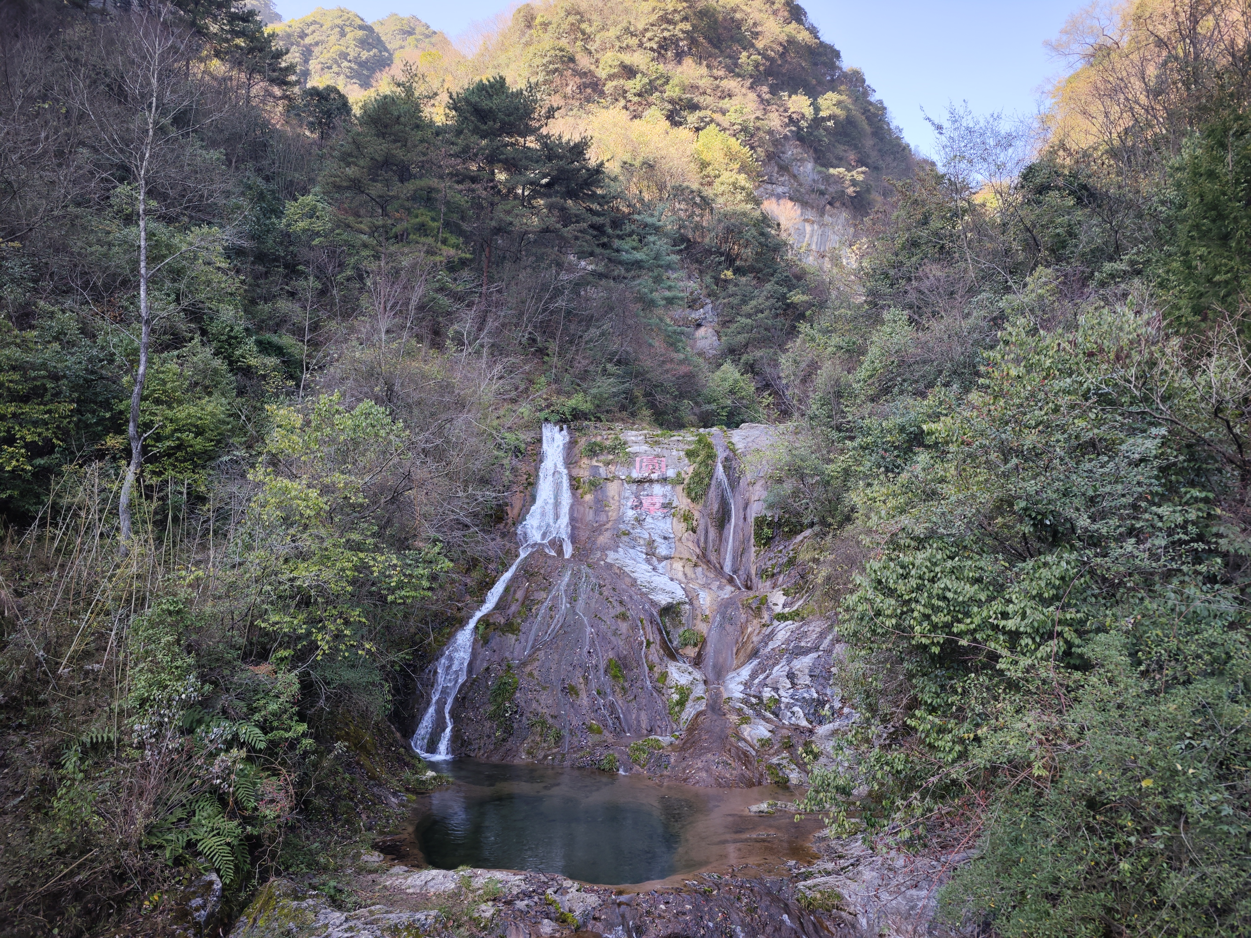 步道长约2公里,沿途只见蜿蜒曲折的溪水顺着山势,从山崖倾泻而下,汇为平静的潭水,形成“三瀑”“三潭”的奇观。越往深处走,葳蕤的树林越显曲径通幽之感,恰似一幅水墨画卷。
