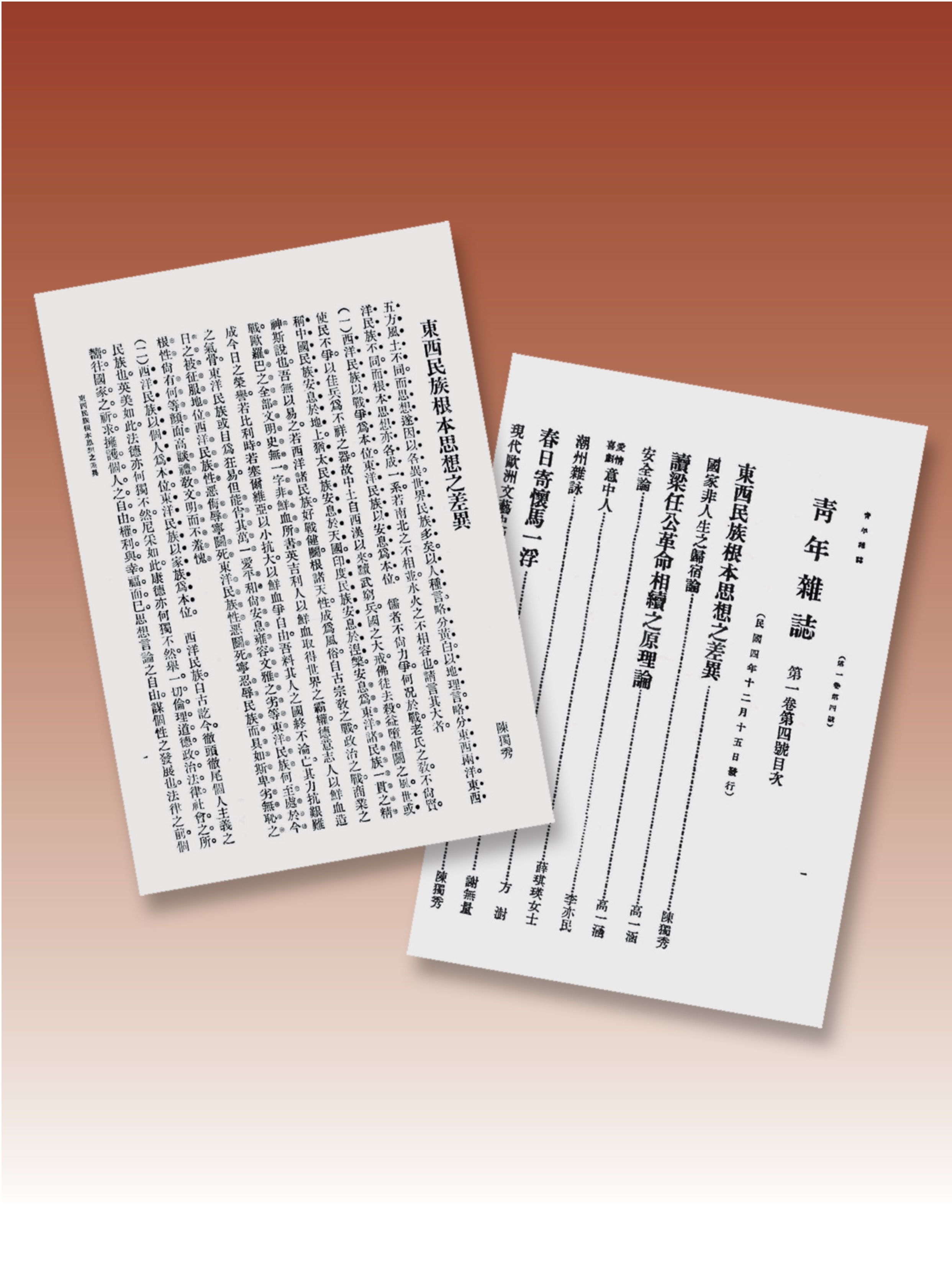1915年12月15日,陈独秀在《青年杂志》第1卷第4号上发表《东西民族根本思想之差异》一文,提出“东洋民族”要改变落后状况,就要以“个人本位主义”代替“家族本位主义”。图为《青年杂志》第1卷第4号上刊登的《东西民族根本思想之差异》。