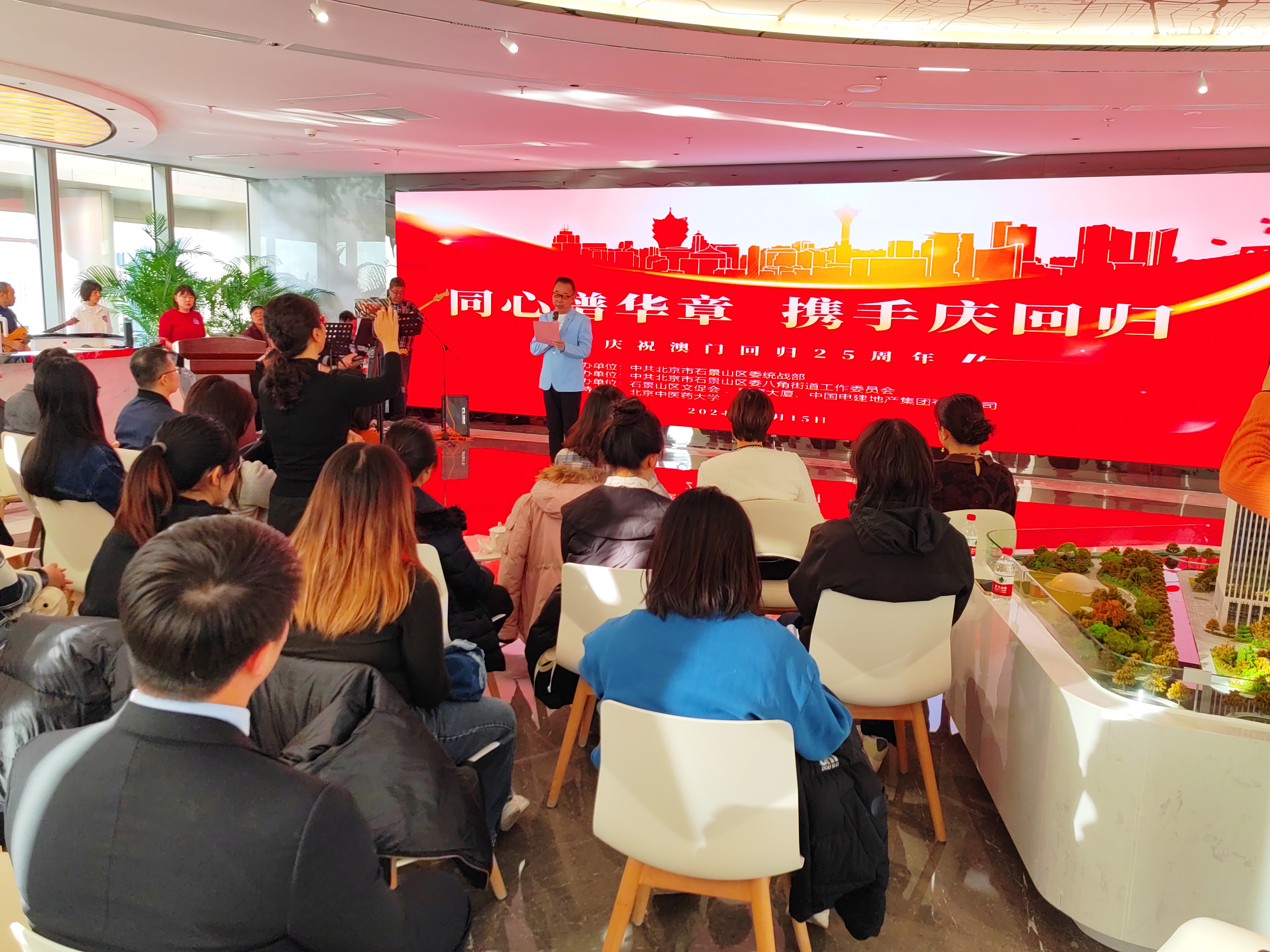 12月15日,由石景山区委统战部主办,八角街道党工委承办,石景山区文促会、翔鹰大厦、中国电建地产集团有限公司协办,北京中医药大学给予大力支持的“同心谱华章 携手庆回归”庆祝澳门回归25周年活动在石景山区八角街道翔鹰大厦举办,来自北京中医药大学的港澳台同学、八角街道社区居民共计50余人参加活动。