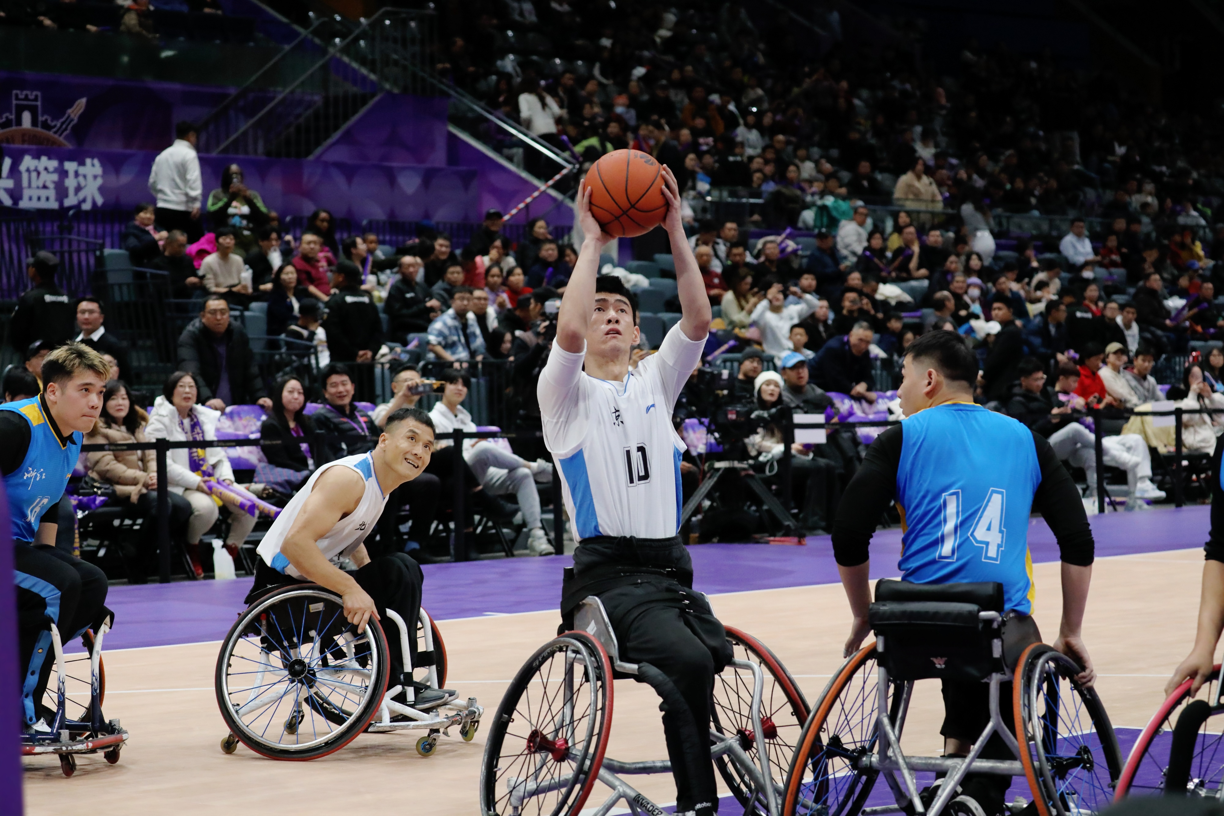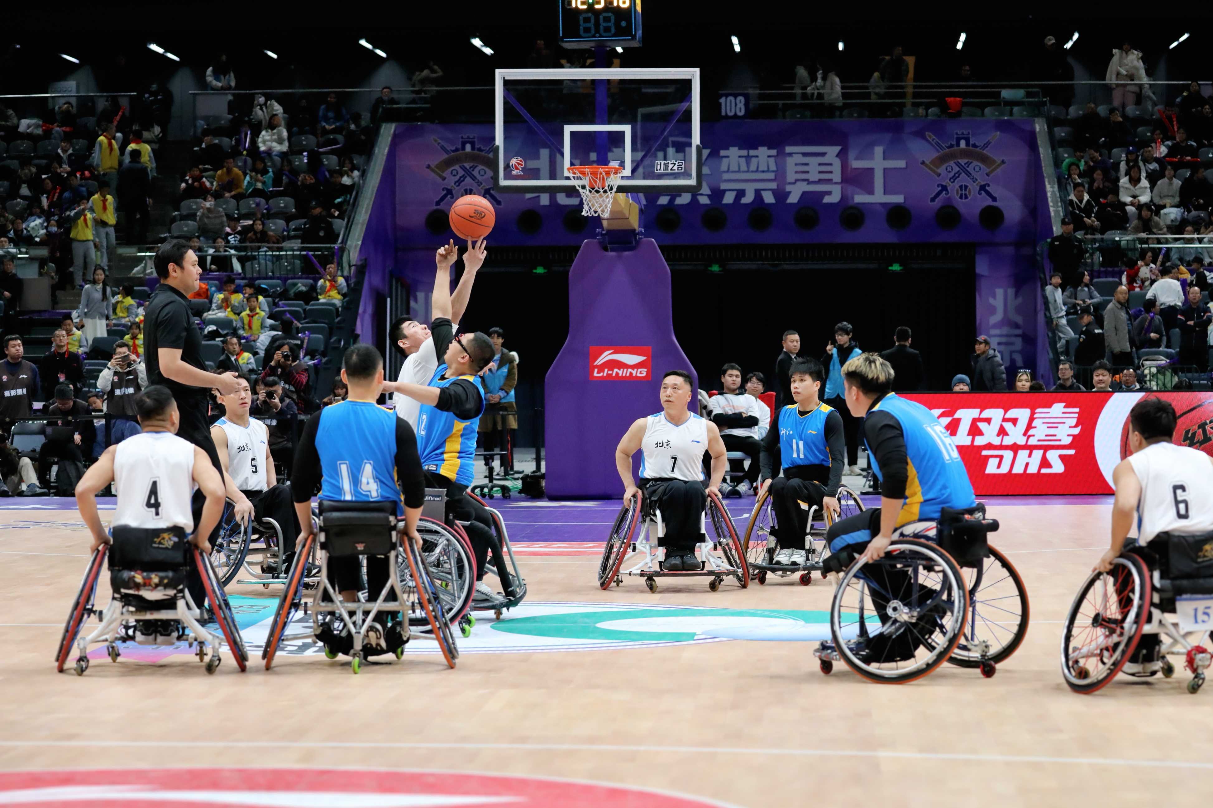 当日进行的CBA联赛北京北控队对阵新疆队的比赛中场休息时,北京轮椅篮球男队、浙江轮椅篮球男队的12名轮椅篮球队员登场,向现场观众展示这项极具观赏性的残疾人运动项目。他们通过运动技术、战术配合、精准投篮,展示轮椅篮球的魅力。