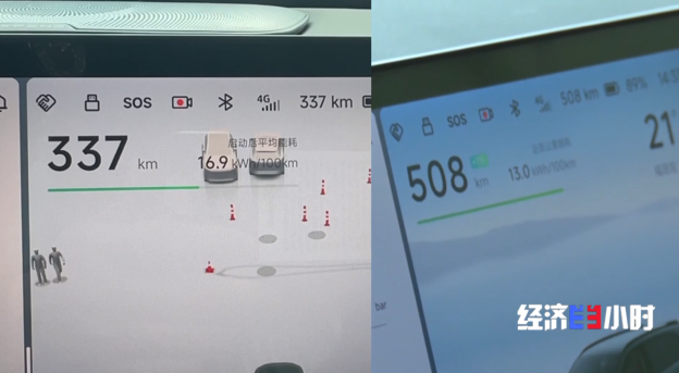 记者将充电比例设置为89%。14分钟之后,充电完成。从车辆的行车界面上看,剩余里程数已经从此前的337公里,提升到508公里。也就是说充电14分钟,续航提高了171公里。