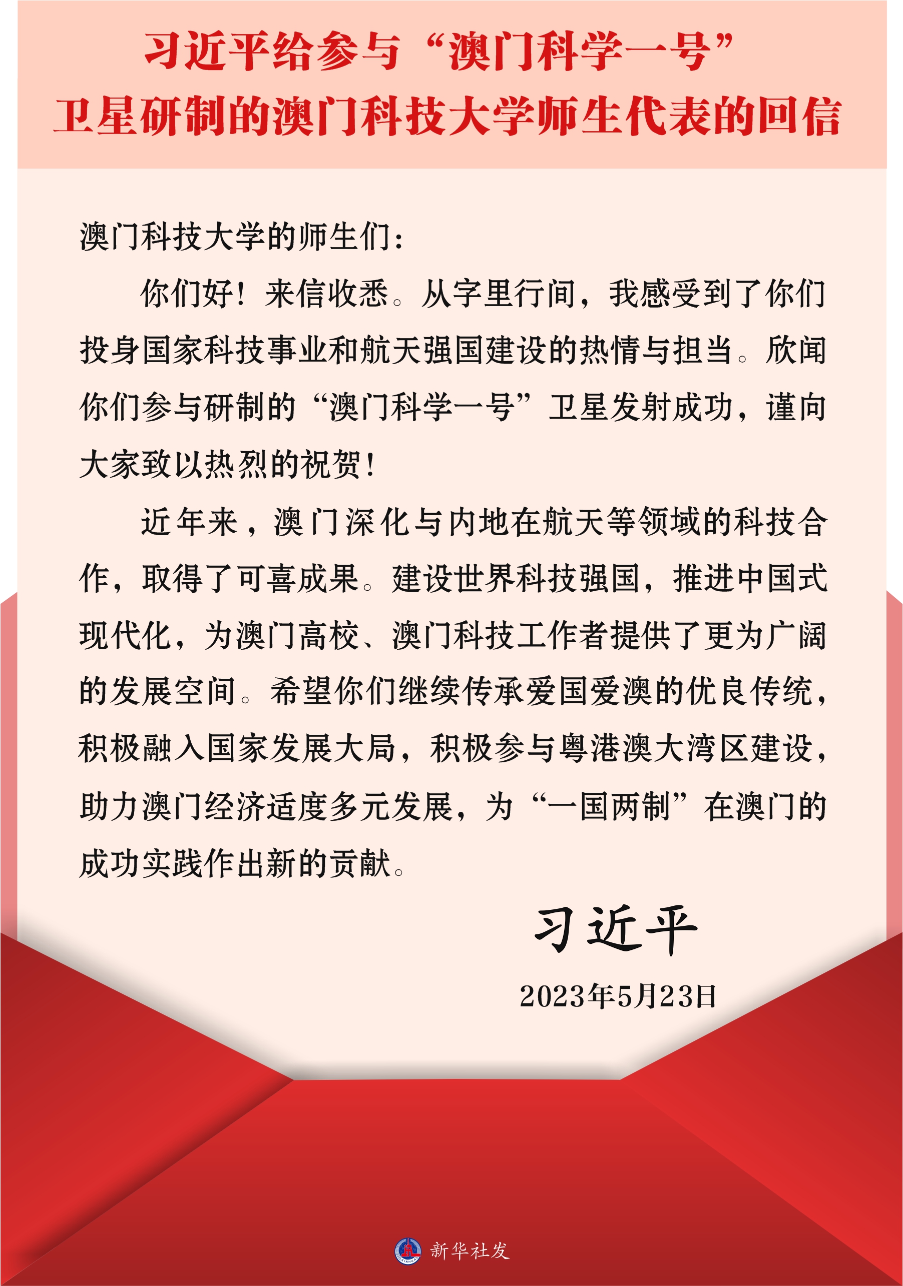 参与卫星研制的澳门科技大学18名师生代表给习近平主席写信,汇报卫星成功发射的喜讯和参与卫星研制工作的感受。5月23日,习近平主席给参与“澳科一号”卫星研制的师生代表回信,对他们予以亲切勉励。