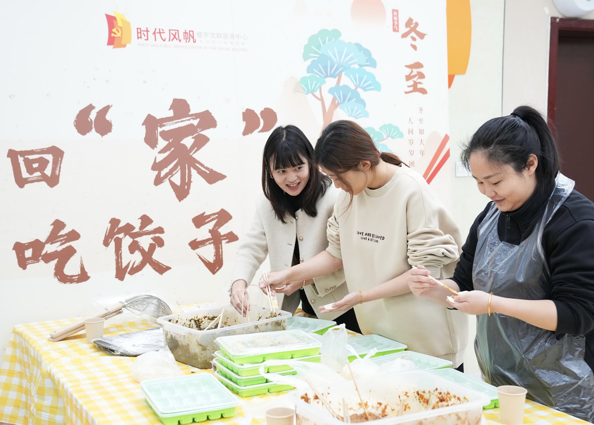 中午12时许,时代风帆楼宇党群服务中心一层的大厅变身“餐厅”,一张张桌子已经摆好,冬至回“家”吃饺子的背板前,一盒盒都是党群服务中心工作人员趁早包的饺子。