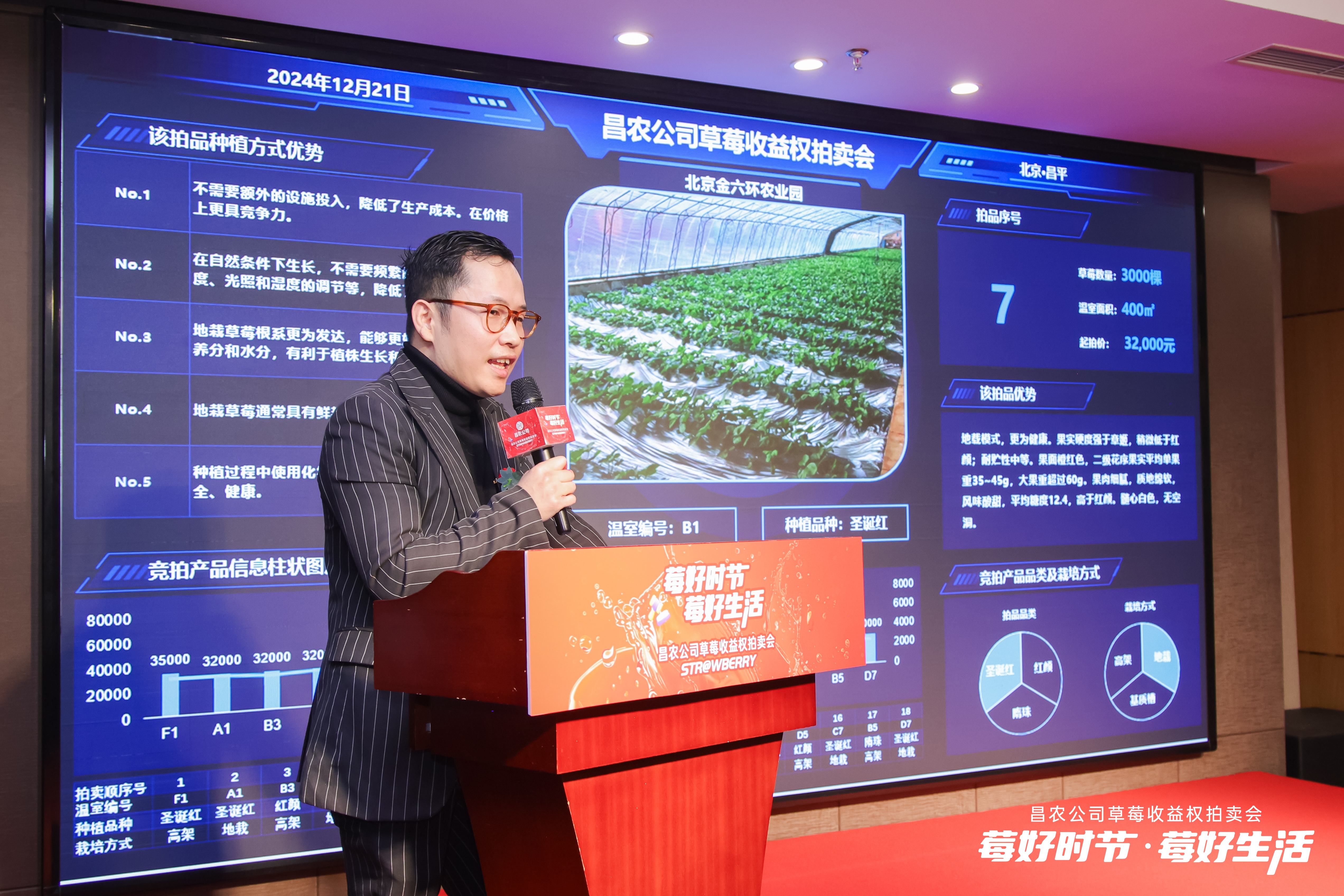 本次的拍品除了温室内的全部草莓果实,还附赠棚室管理、疏花疏果、分级采收、施肥浇水等草莓生长全程的技术指导,以及草莓管家、采摘快递等服务内容,每栋温室草莓收益权的起拍价在3万元到7万元不等。