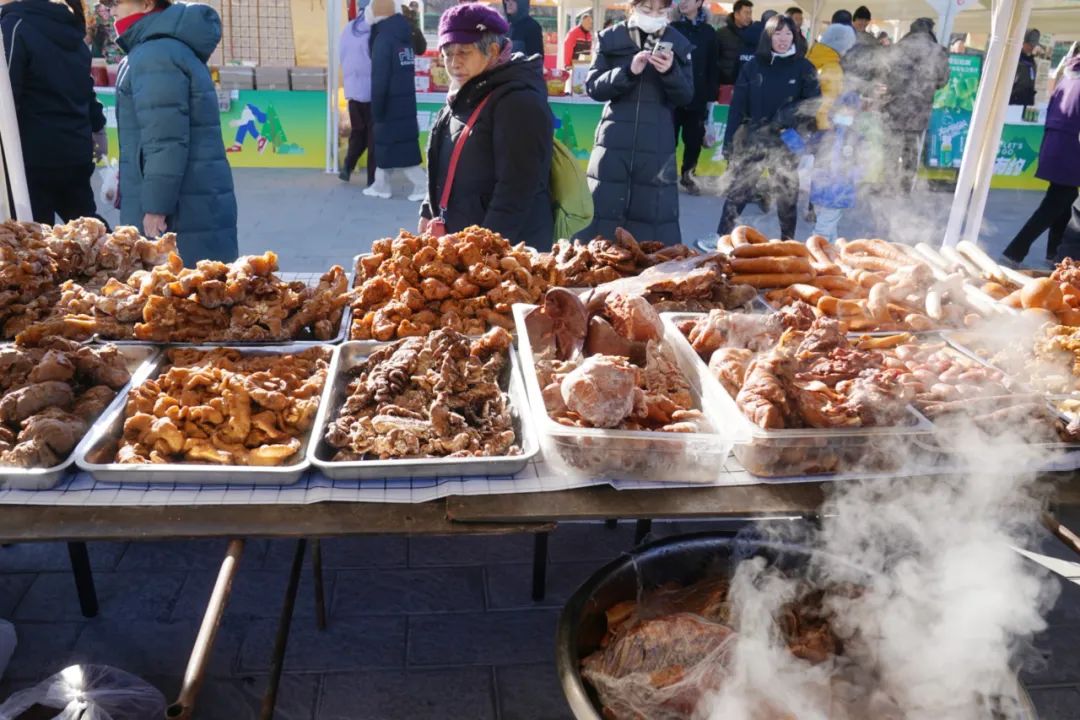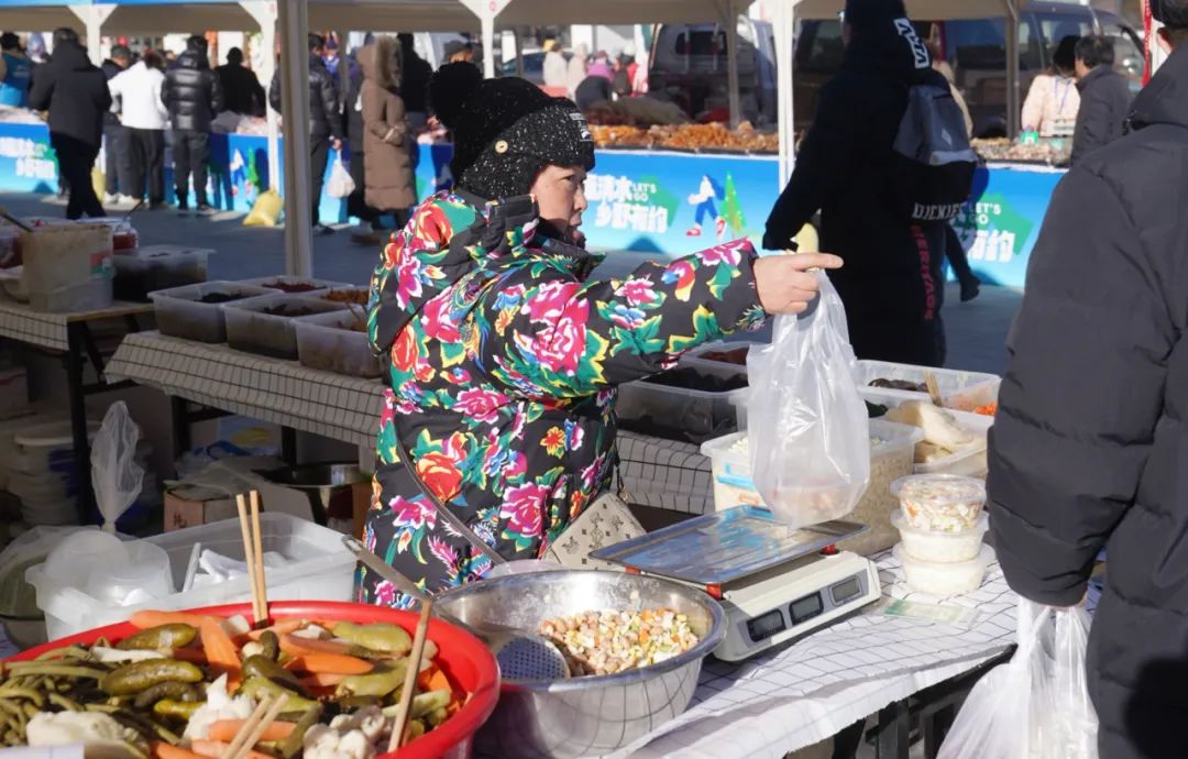 萝卜、小米、蜂蜜、肉肠……琳琅满目的特产让人目不暇接。吆喝声、问价声交织一片,夹杂着笑声和打招呼的声音。大集上共有78个摊位,有本地农特产品,河北张家口等地的特色美食也纷纷亮相:暖泉镇的糖麻叶金黄酥脆,九龙镇的驴打滚软糯可口,矾山镇的肉夹馍香气四溢,谢家堡乡的炸油糕外酥里嫩。