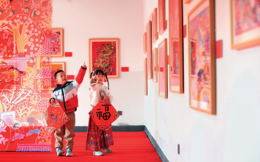 “城之源·都之始·河之端”北京市西城区2024年春节“赏年画过大年”美术作品展在北京厂甸庙会火神庙内展出。图为小朋友手拿福字参观展览(2024年2月摄) 北京市西城区委宣传部供图
