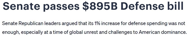 美国《国会山报》:美国国会日前通过的2025财年军费预算总额超过8950亿美元,较上一财年增长1%,再创历史新高。即便如此,参议院共和党领导人仍认为1%的增幅是不够的,“尤其是在全球动荡和美国主导地位受到挑战的时候”。