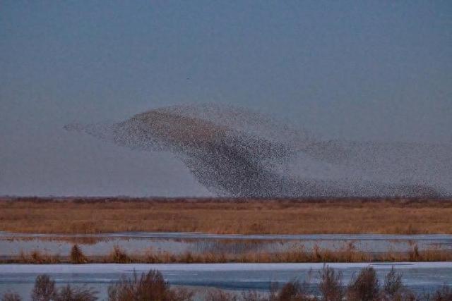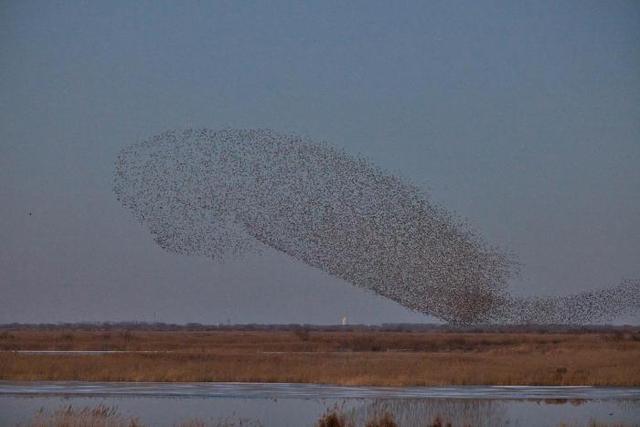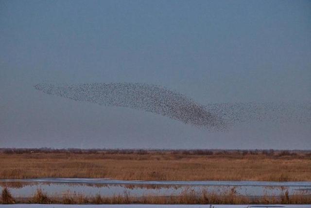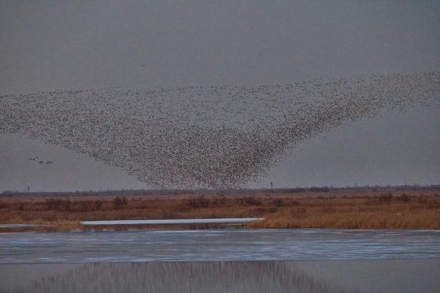 12月22日,山东黄河三角洲国家级自然保护区湿地上空频现“鸟浪”景观。