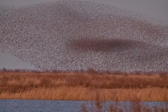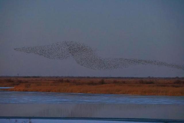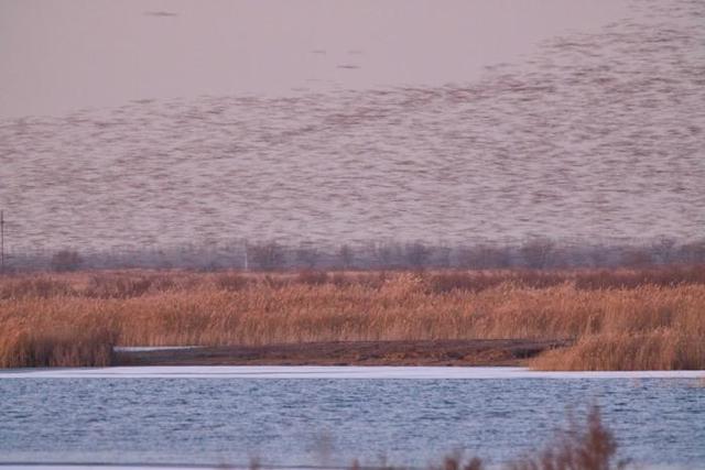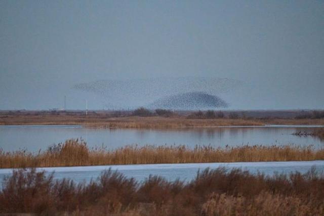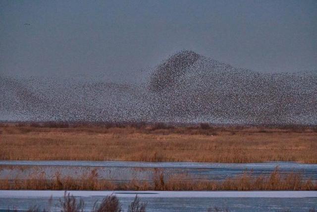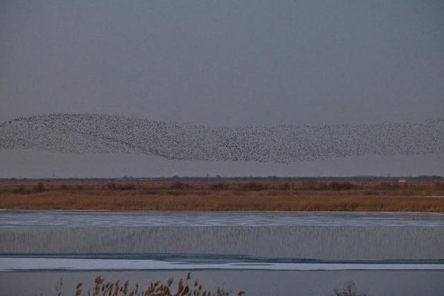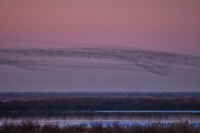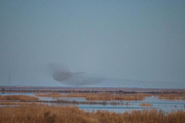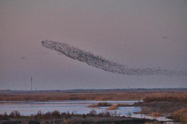 深冬时节,气温走低,位于东营的山东黄河三角洲国家级自然保护区迎来候鸟迁徙高峰,170多种近百万只候鸟从西伯利亚等地迁徙而来,到此栖息越冬或暂时停歇,成群结队的候鸟在空中翱翔,时而低空掠过水面,时而又冲向高空,在空中组合成不同的飞翔队列,形成一波又一波“鸟浪”景观。