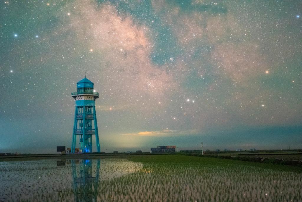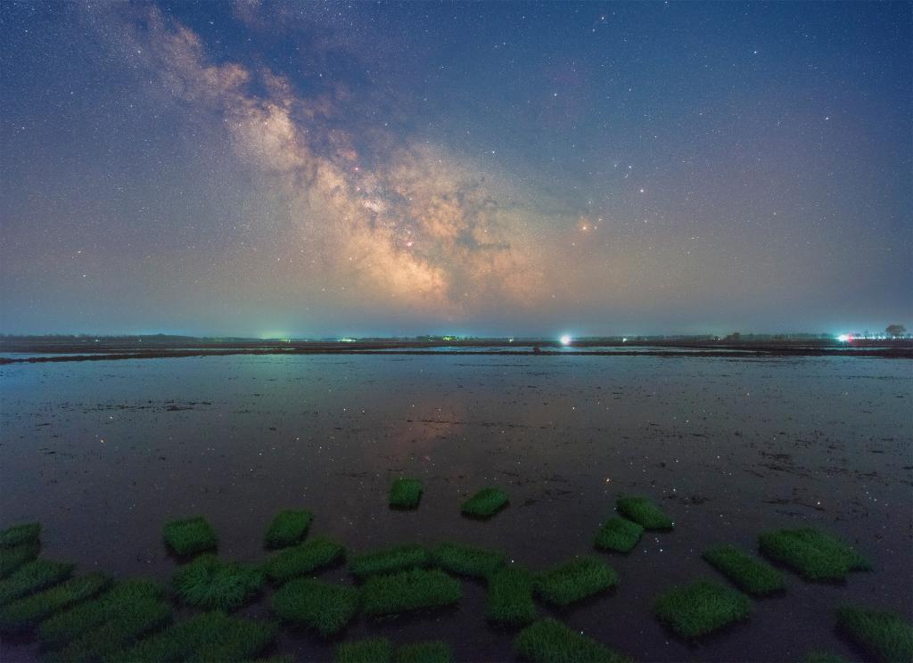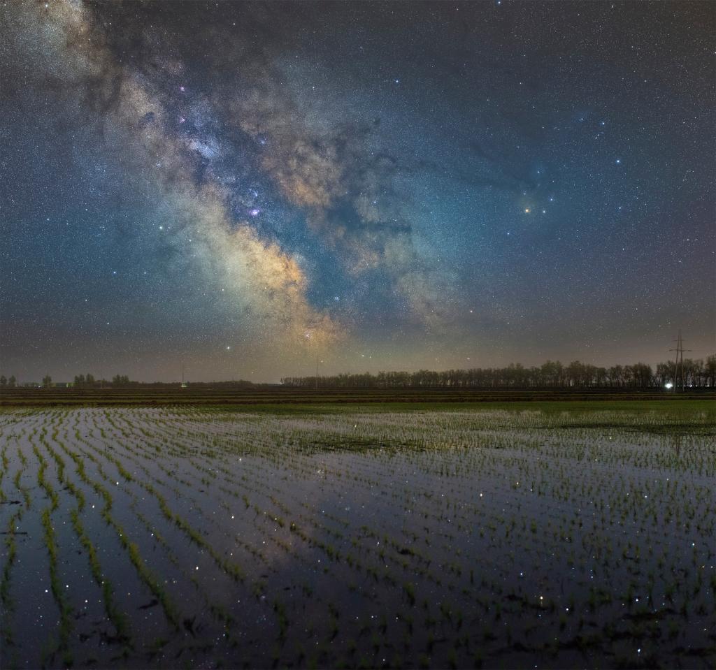 五、六月间,黑土地上的春耕备耕工作如火如荼。繁星的倒影洒在水田中,像是播下宇宙的神秘礼物。为了拍出浮在“星田”里的秧苗,我提前计算银河升起的方位,经过连续几天蹲守,终于如愿以偿。