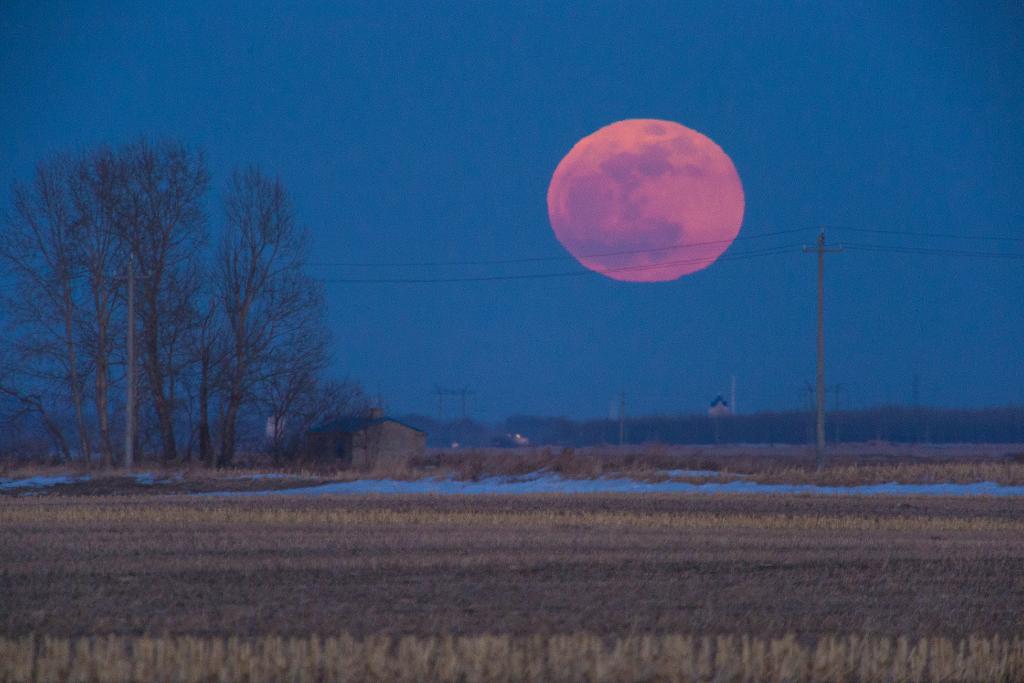 一轮满月在富锦一处田地上空冉冉升起(3月25日摄)。