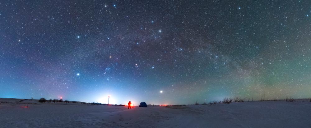 二、三月间,三江平原依旧白雪皑皑,而此时的夜空繁星璀璨,用接片的方式将其集结在一幅画面上,可以营造出雪映星斗的浪漫景象。