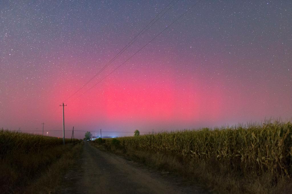 玉米地上空出现粉红色北极光(10月8日摄)。