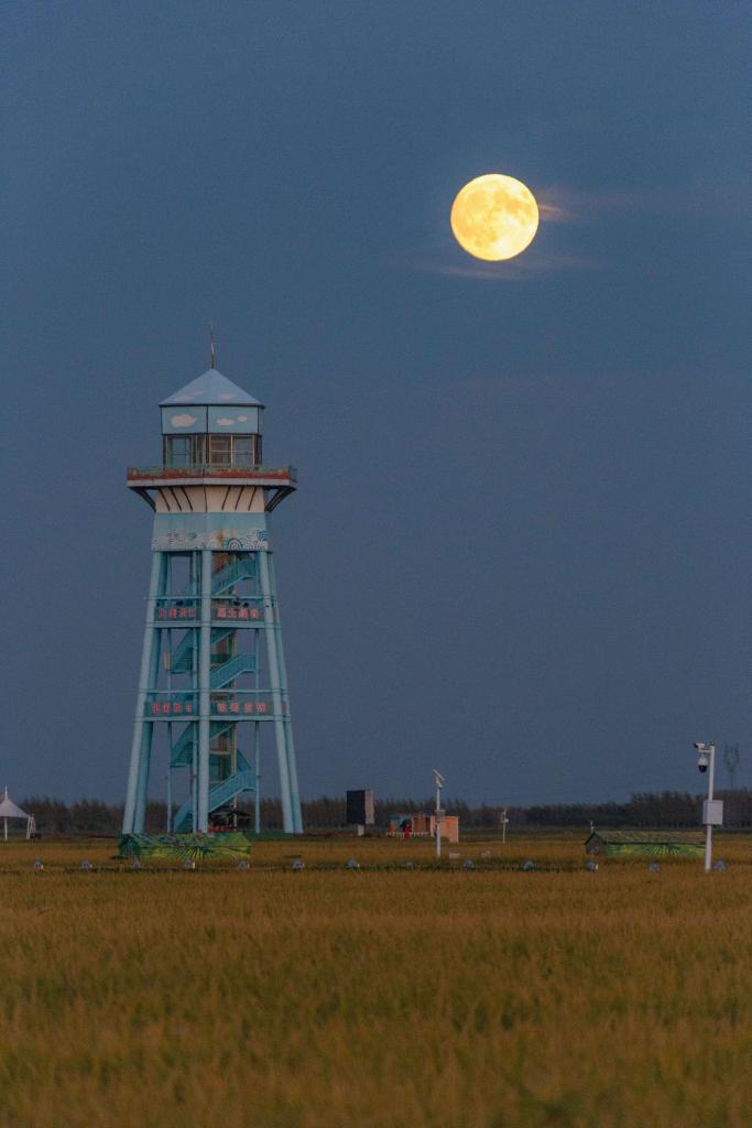 富锦万亩水稻公园上空的中秋“超级月亮”(9月17日摄)。