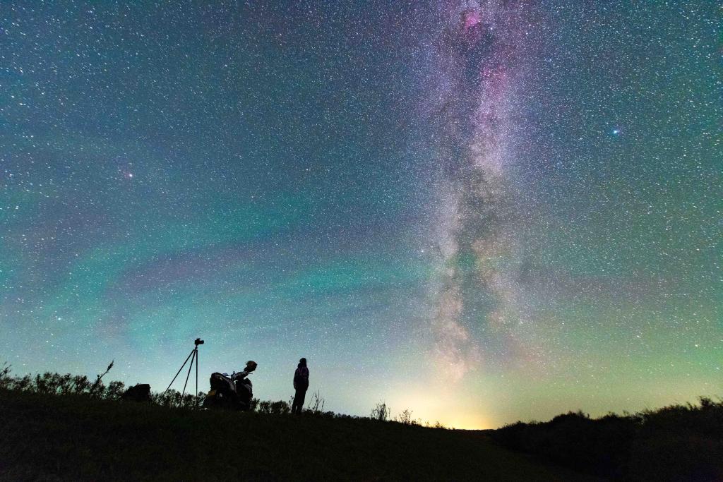 9月初,有一次能拍到“气辉涟漪”的良机。深夜里,我骑摩托迎着大风前行,甚至不时感到车有些“飘”。在寒风中寻找良久,才发现合适的背风处,通过长时间曝光顺利拍到美景。