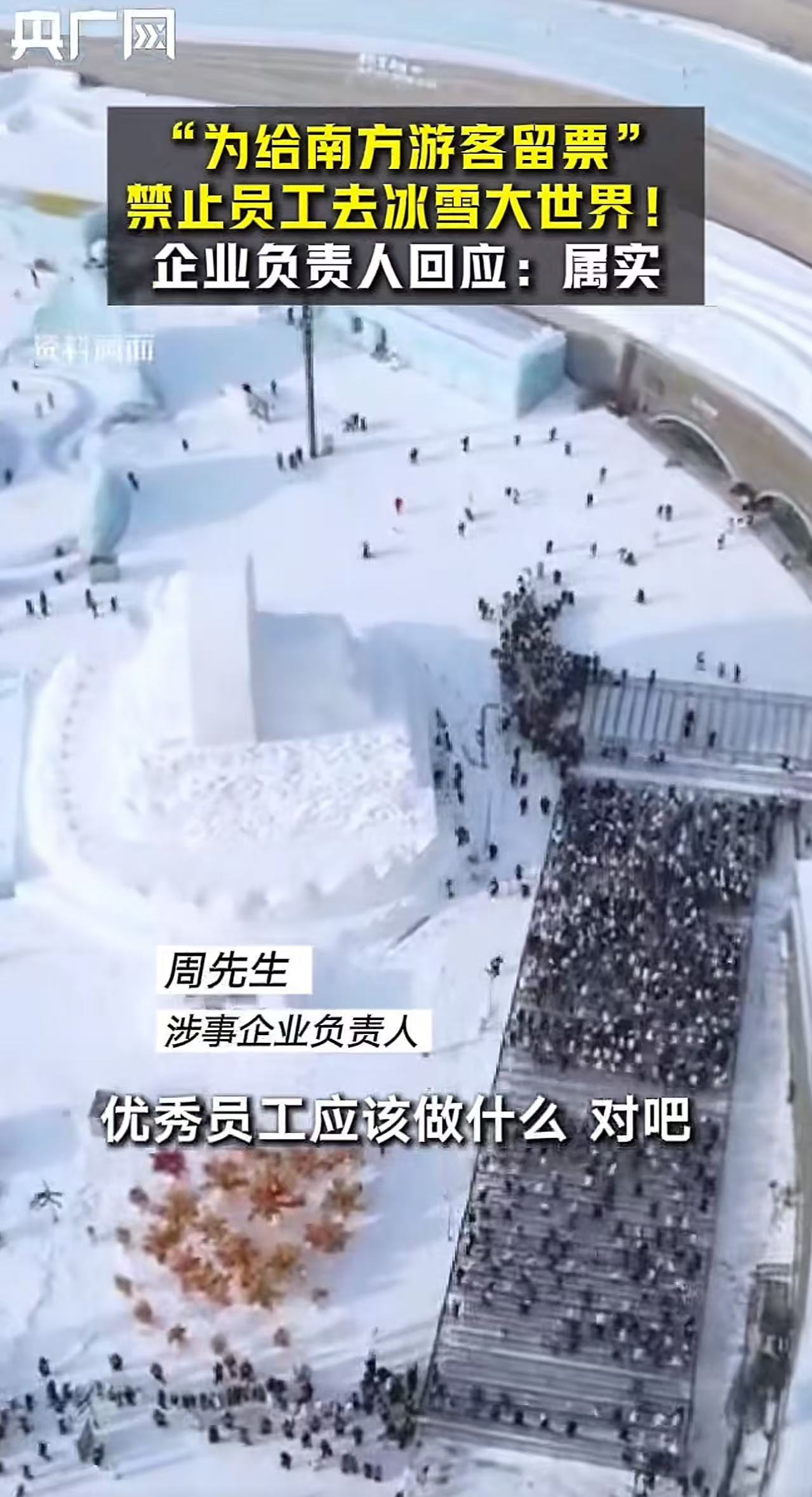 “鉴于当前门票资源的紧张状况,为了能够让更多远方的朋友得以亲身体验这份冰雪奇缘,企业要求员工暂时停止冰雪大世界游玩计划。如有违反此要求的行为,将取消年度优秀员工评选和年终福利领取资格”。12月21日,黑龙江某公司发布的一则通知引起争议。12月23日,该公司负责人回应称,已发布补充通知,向员工表示歉意,将遵从员工自主选择,不作强制要求。