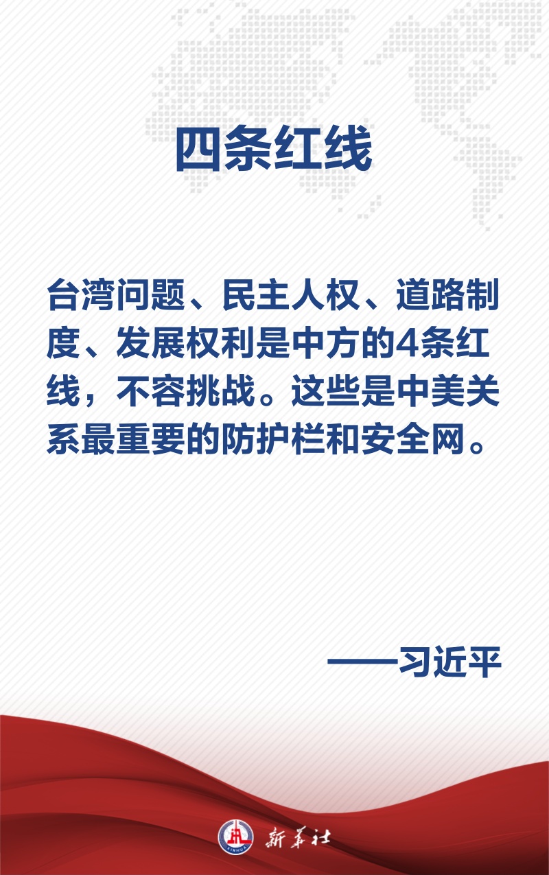 这四条红线,构成了中美关系大厦的基座。基座不稳,大厦的安全性、稳定性无从谈起。中美是两个大国,难免有些分歧和矛盾,但不能损害彼此核心利益,更不能搞冲突对抗。在中美高层交往中,中方一再强调这些红线,就是让美方了解中方的原则底线,避免误解误判,妥善管控分歧,防止冲突对抗。