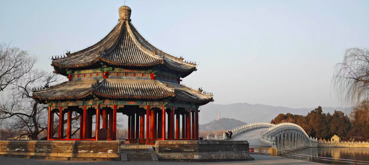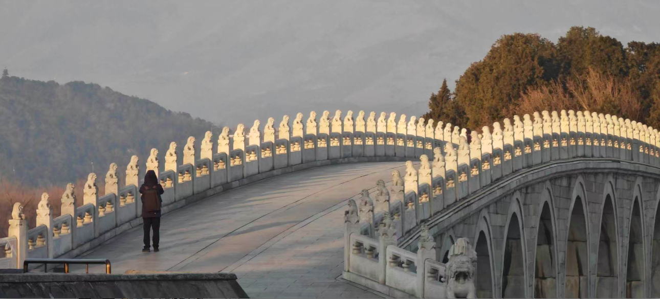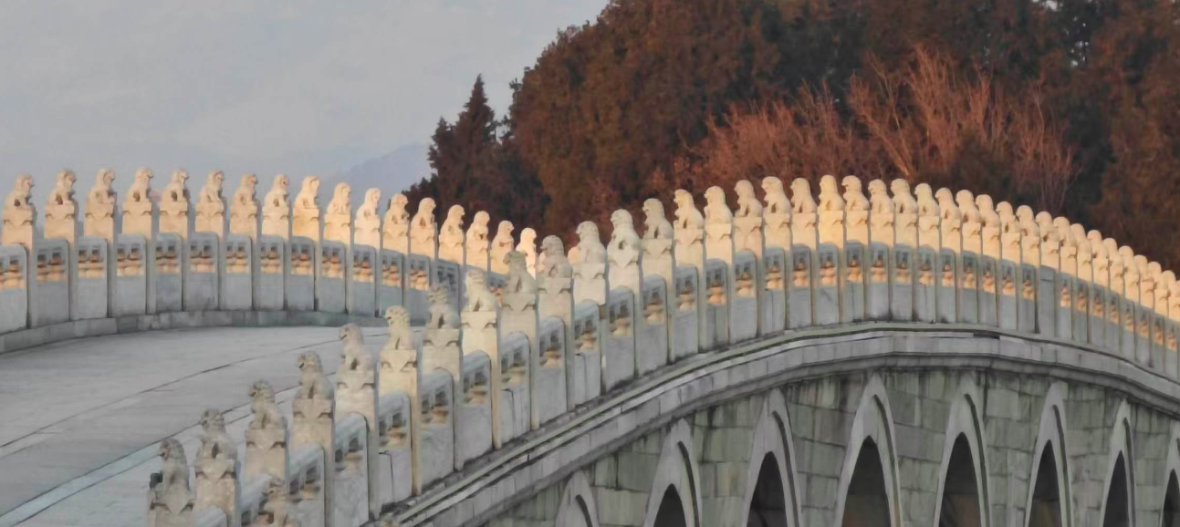 清晨的颐和园,十七孔桥沐浴在阳光之中,小石狮被依次照亮,仿若列阵的金色卫士,静静守护着这份岁月沉淀下的宁静绮丽,桥与湖、光与影,共同绘就了一幅如梦似幻的晨景图。