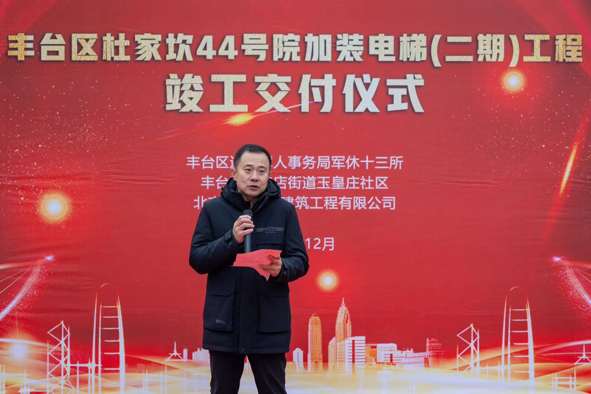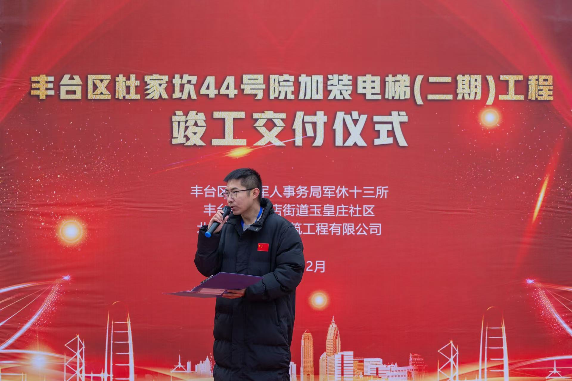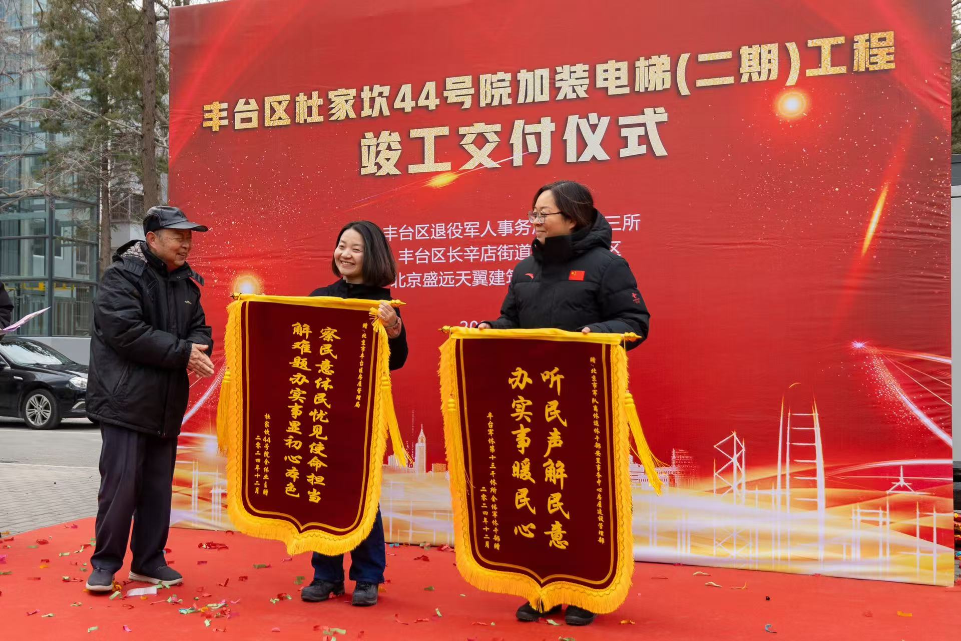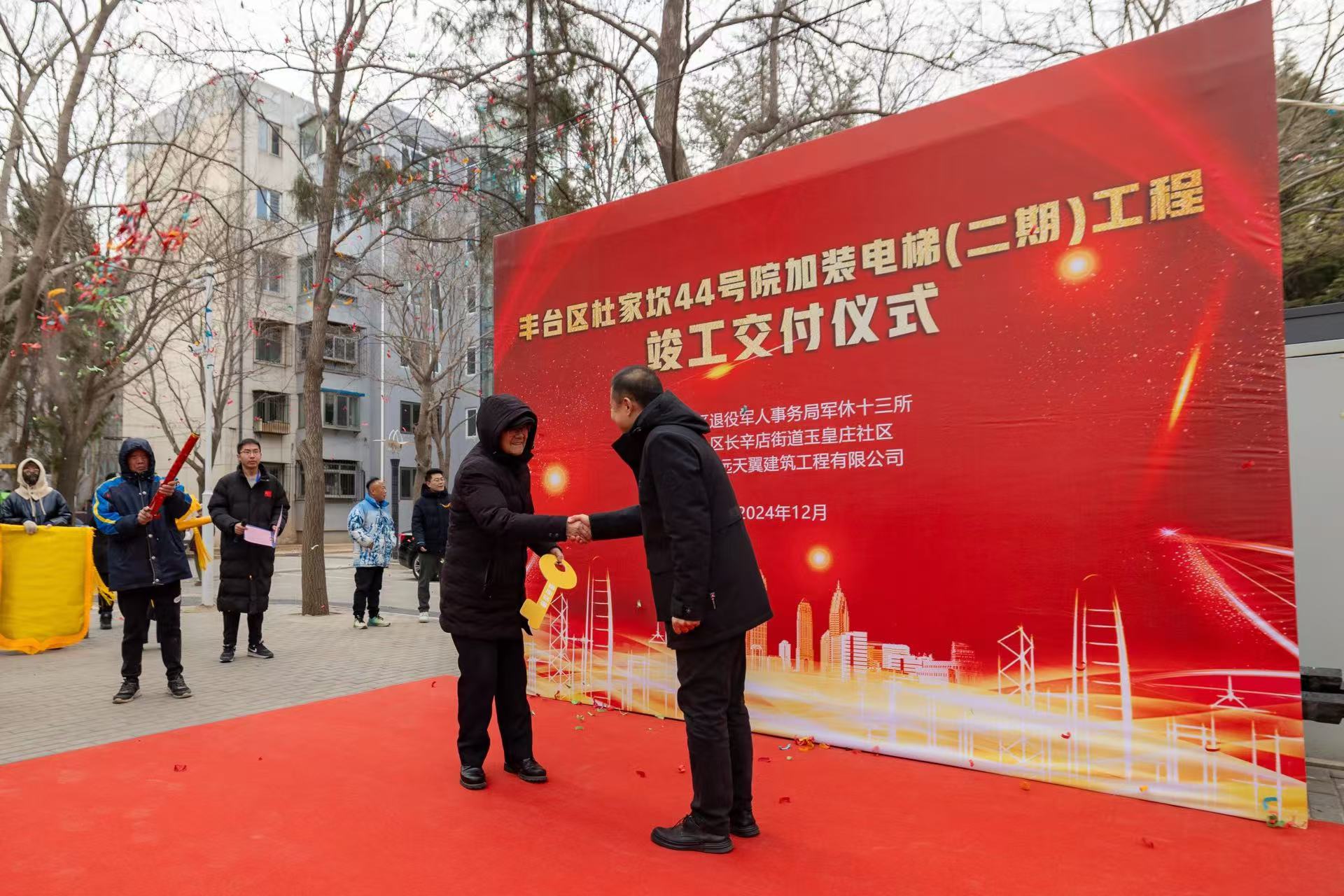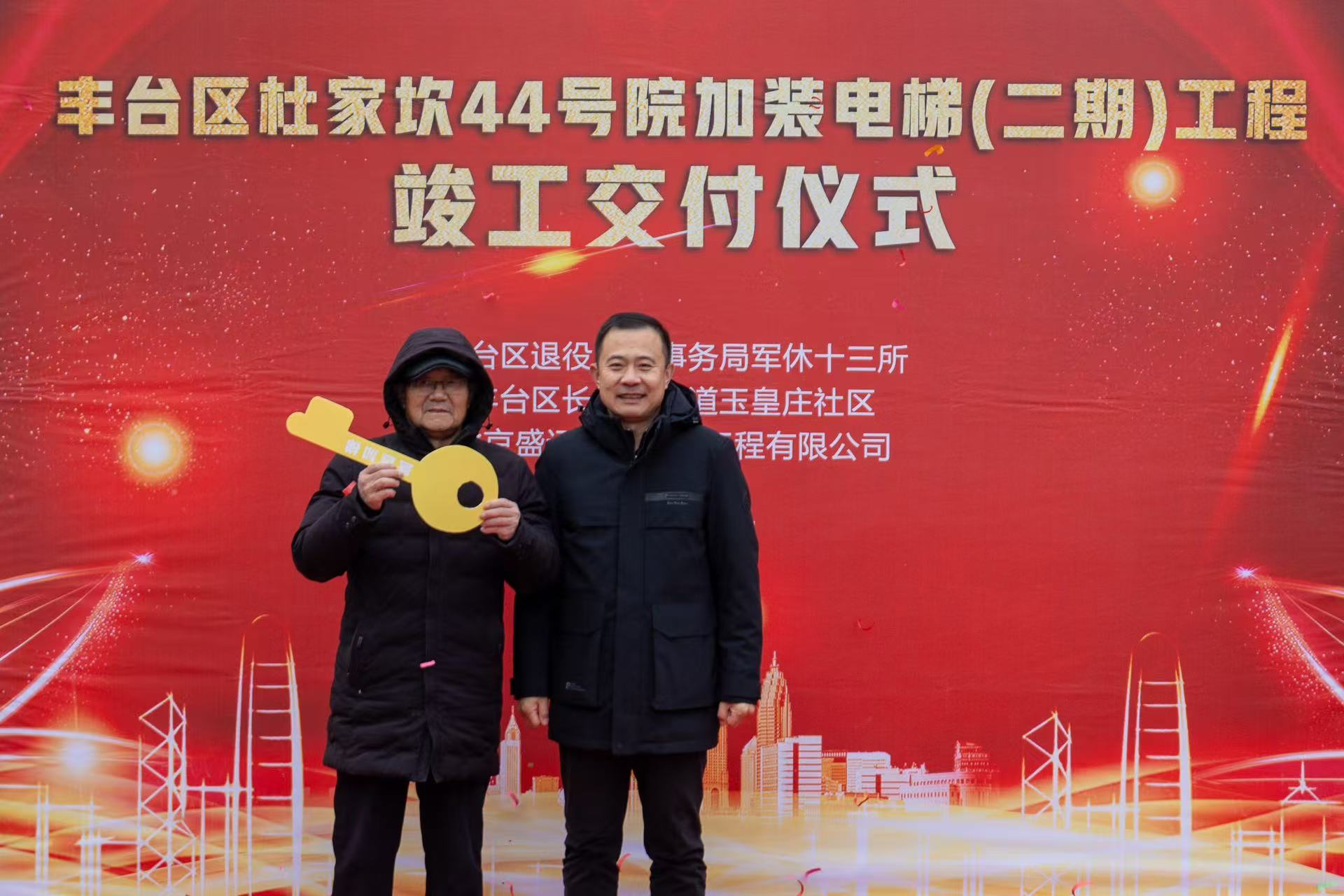 12月26日上午十点整,杜家坎44号院召开了电梯交付仪式,第二期加装的6部电梯正式投入使用,标志着丰台区军休十三所第二期加装电梯工作顺利完成,就此实现44号院内7个楼栋16个单元全部完成电梯加装。今天丰台区军休十三所隆重举行电梯交付仪式,彻底解决了军休干部“出行难”“回家难”的大问题。
