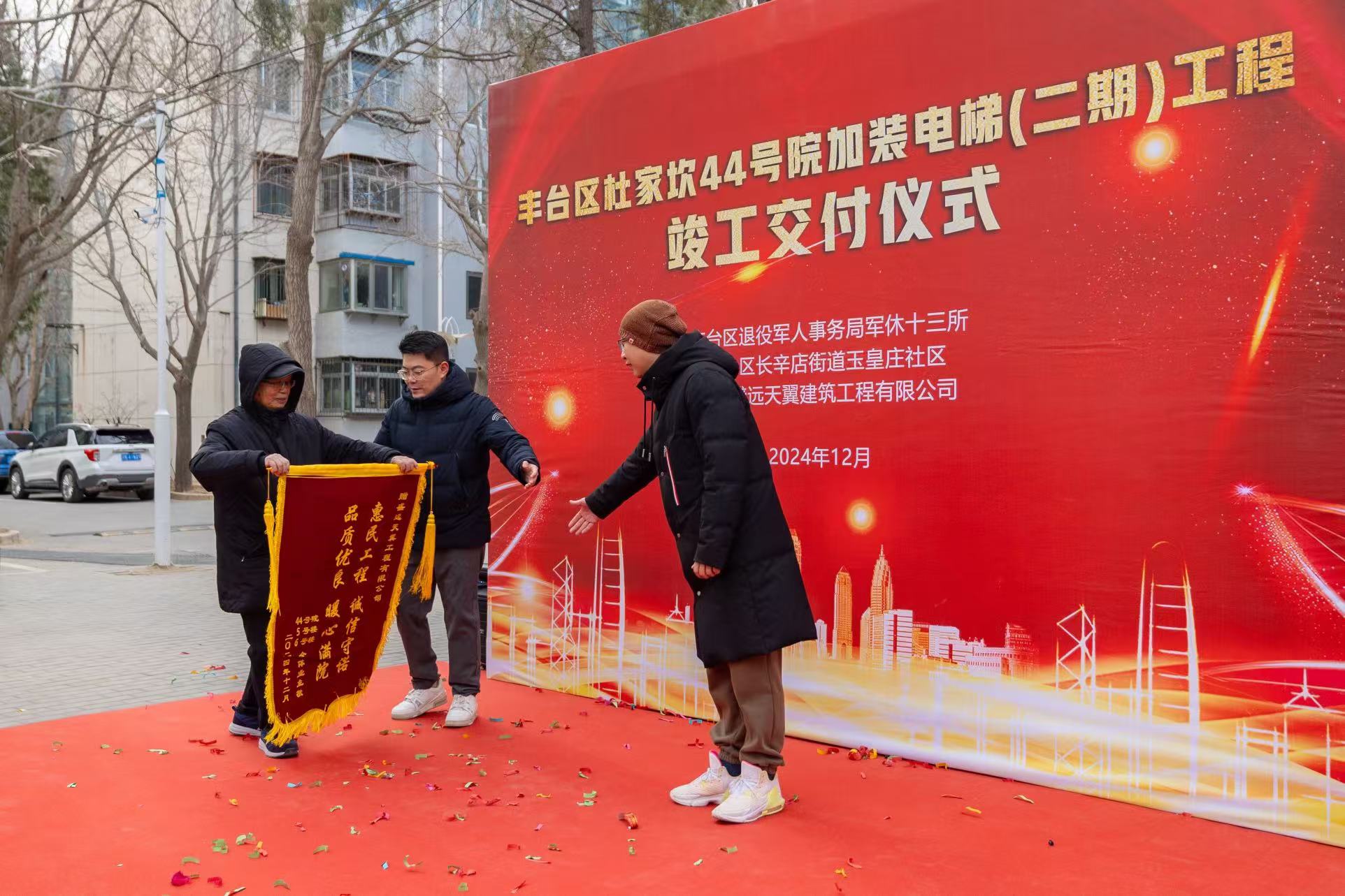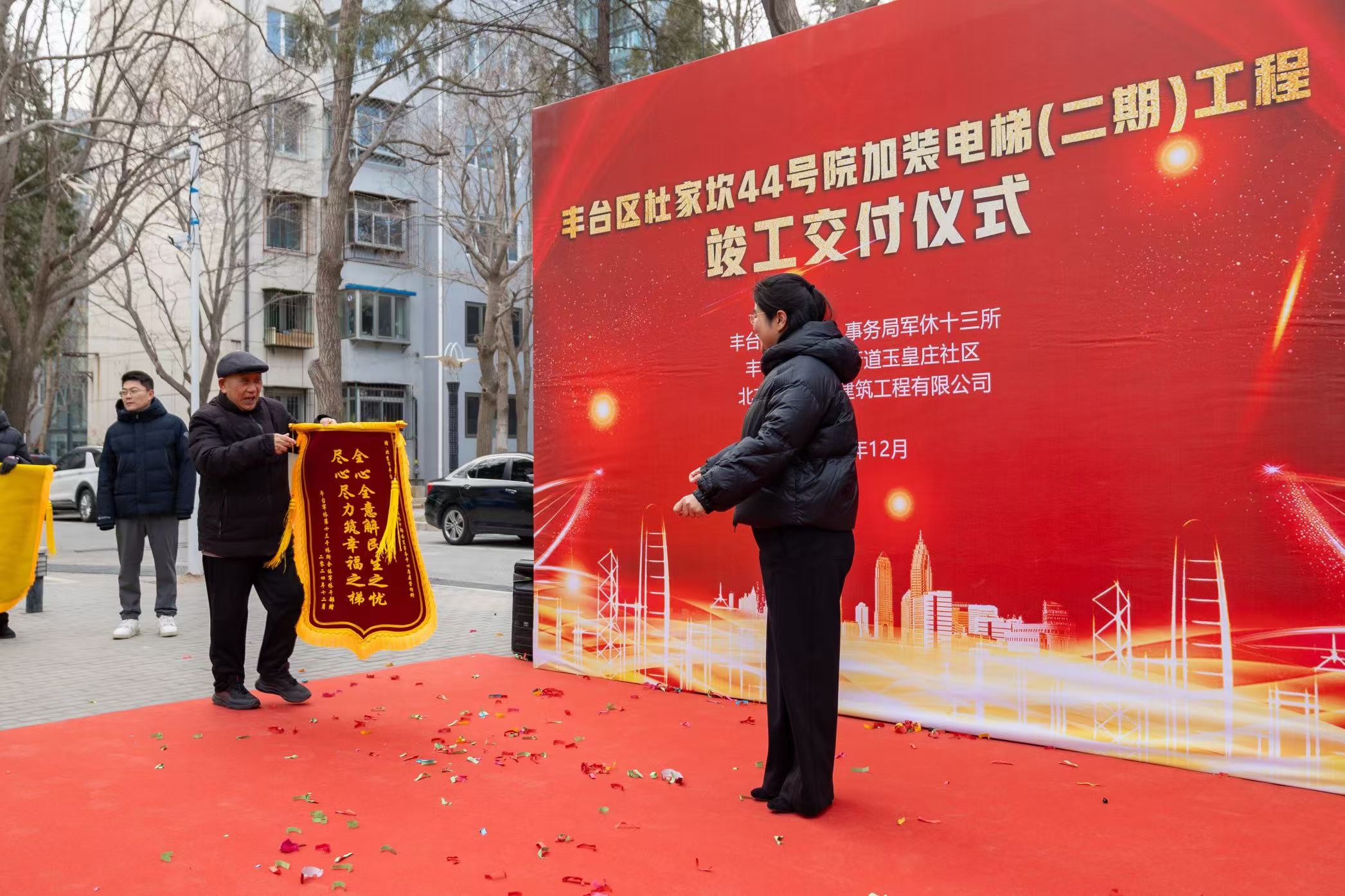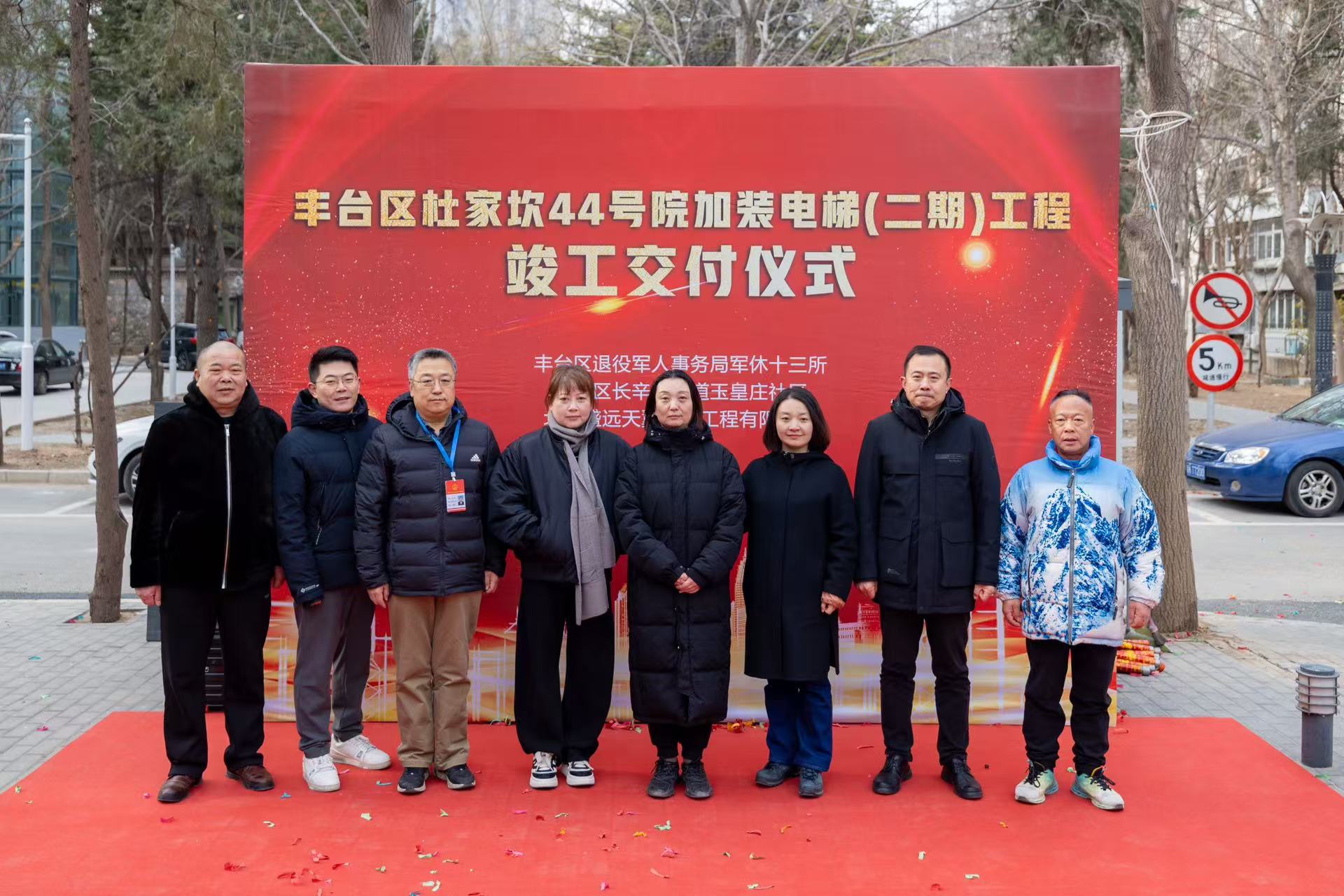 据悉,杜家坎44号院安装电梯得到市军休安置事务中心、丰台区退役军人事务局以及区军休安置事务中心领导的高度重视。有了上级部门指导和协调,不仅拓展到更多资源和力量,工作思路也得以开阔。为了推动装梯工作顺利开展,所内组织军休干部代表到已完成电梯加装的小区作调研。军休干部代表们观摩回来后,更加坚定了安装电梯的决心。在以业主自愿、政府引领加补贴为前提的基础上,多方参与共同推进,制定计划分步进行,把政策交给业主,坚定了每户业主安装电梯的决心,提高了加装电梯的热情,形成了“要我加装”到“我要加装”的生动局面。在多方共同努力下,终于在2022年11月获得了第一期10个单元门栋加装电梯确认书,又在2023年12月获得第二期6个单元门栋加装电梯确认书,并于2024年12月,整体工程竣工验收合格。就此,杜家坎44号院“电梯之役”取得了决定性的胜利。