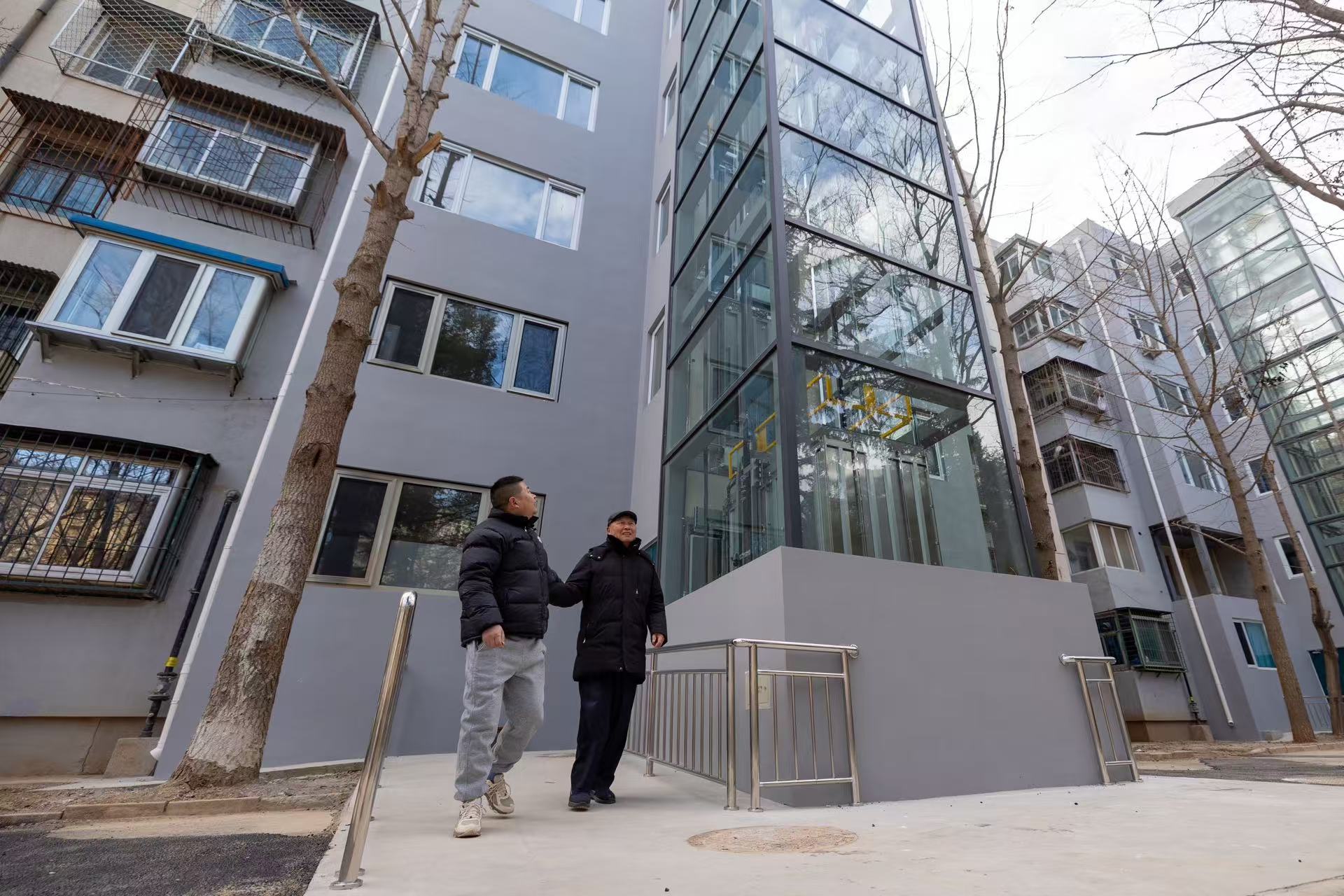 记者了解到,44号院内,新落成的电梯挺拔大气,格外“吸粉”。电梯安装采用了平台式设计方案,电梯位置在原楼门的北面,利用电梯与原楼门之间的空间,修建了电梯停靠的平台,除了平台还为每户增加了八平方米的连廊,连廊内,根据业主的意愿安装了不同材料的窗户,既不影响正常采光又让每户获得了很大的实用空间。电梯的井道,由双层钢化夹胶玻璃或新型材料——保温一体板建设而成。从外面看,就像在楼体上镶嵌了火箭发射架,既美观又装点出了专属于军休大院的独特气质。