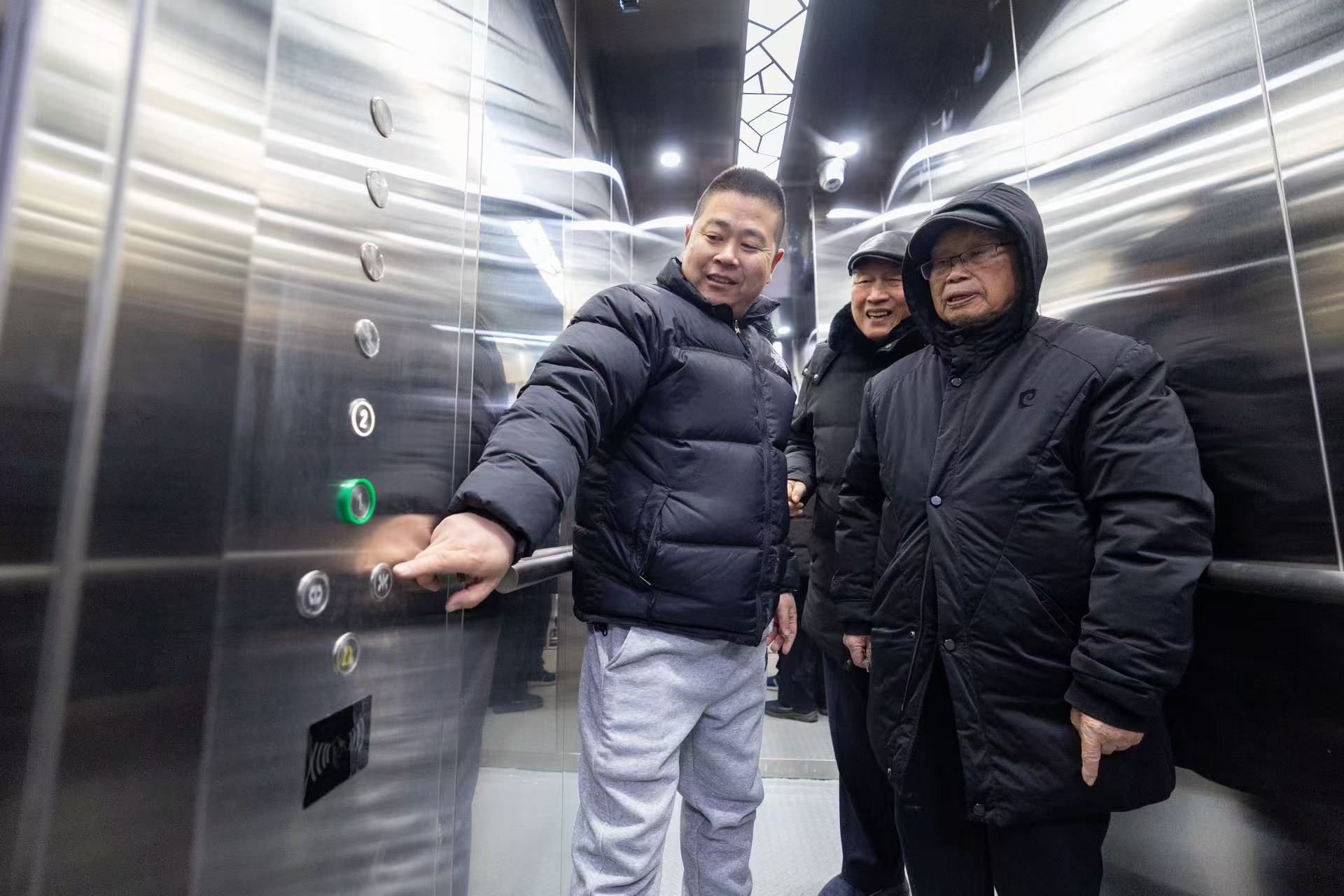 电梯前,不少人拿出手机迫不及待记录自己第一次乘坐电梯的体验。走进电梯,轿厢空间宽敞,足够轻松容纳13个人,不管推轮椅还是急救担架,亦或搬运东西都不再让人发愁。上升过程中感觉不到一点颠簸和噪音,有军休干部感叹道“这就是我们想要的方便梯、救命梯、幸福梯。”还有军休干部坐完电梯后又找工作人员帮忙,“这电梯真好!运行的平稳也没有声音,帮我录个像,我要分享给孩子和朋友们看看”。军休干部包立春把喜悦和赞誉作成了诗:玻璃井道莱茵梯,呼键一摁上下行。老幼妇孺齐称赞,多年逐梦终实现。