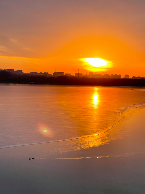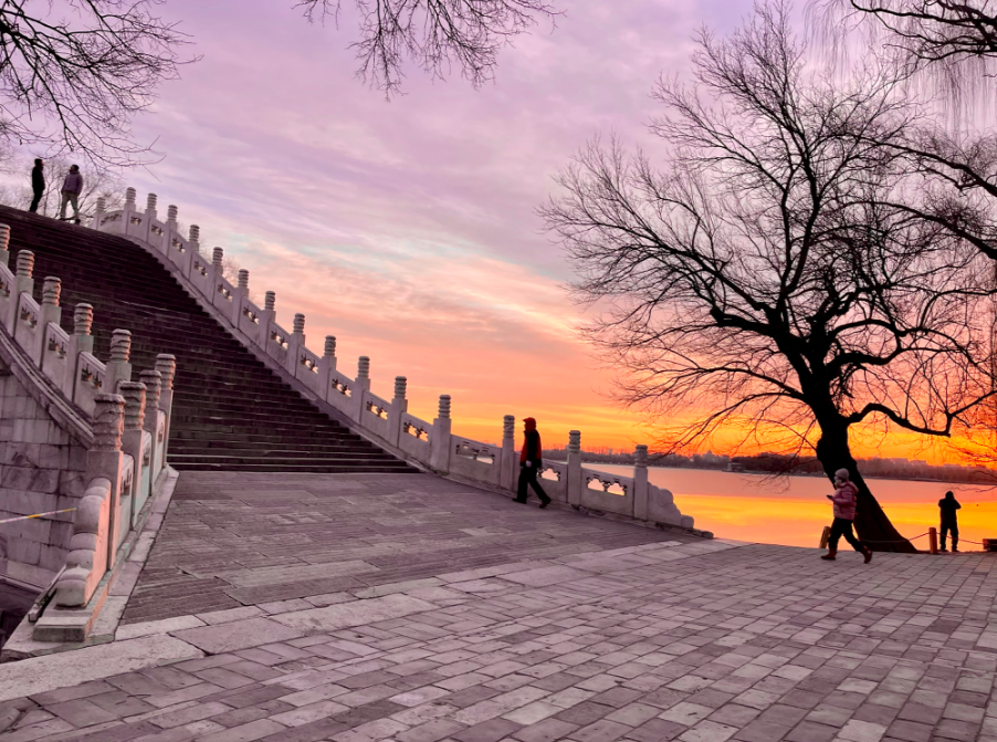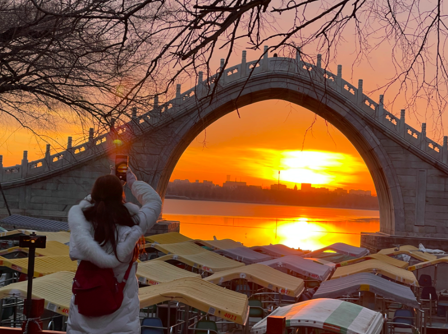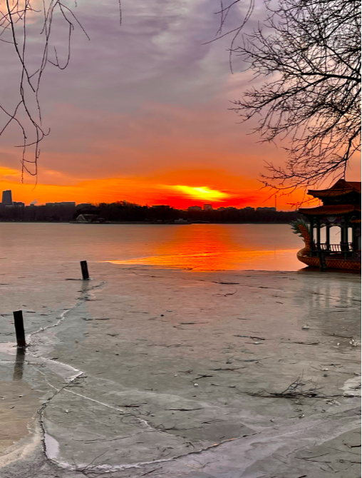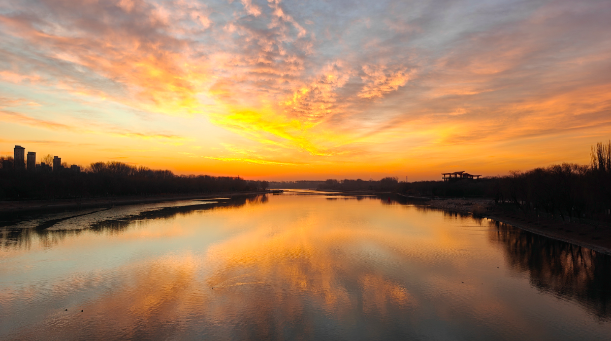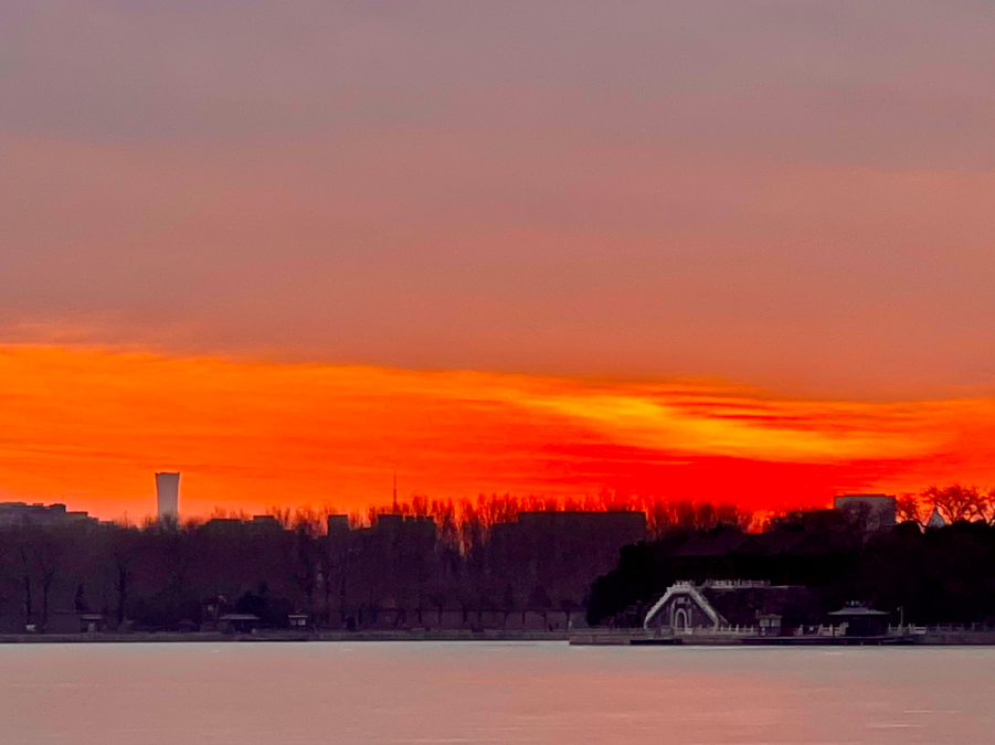 金色晨光洒向湖面,今早的北京太美了!
