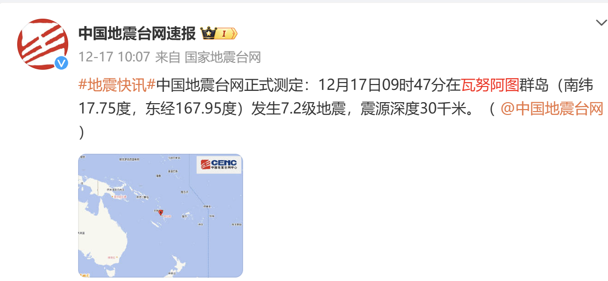 中国地震台网正式测定,北京时间2024年12月17日9时47分,在瓦努阿图群岛发生7.2级地震。地震发生后,中国地震局立即启动国外显著地震应急工作机制,密切跟踪灾情并组织开展专题分析研究。