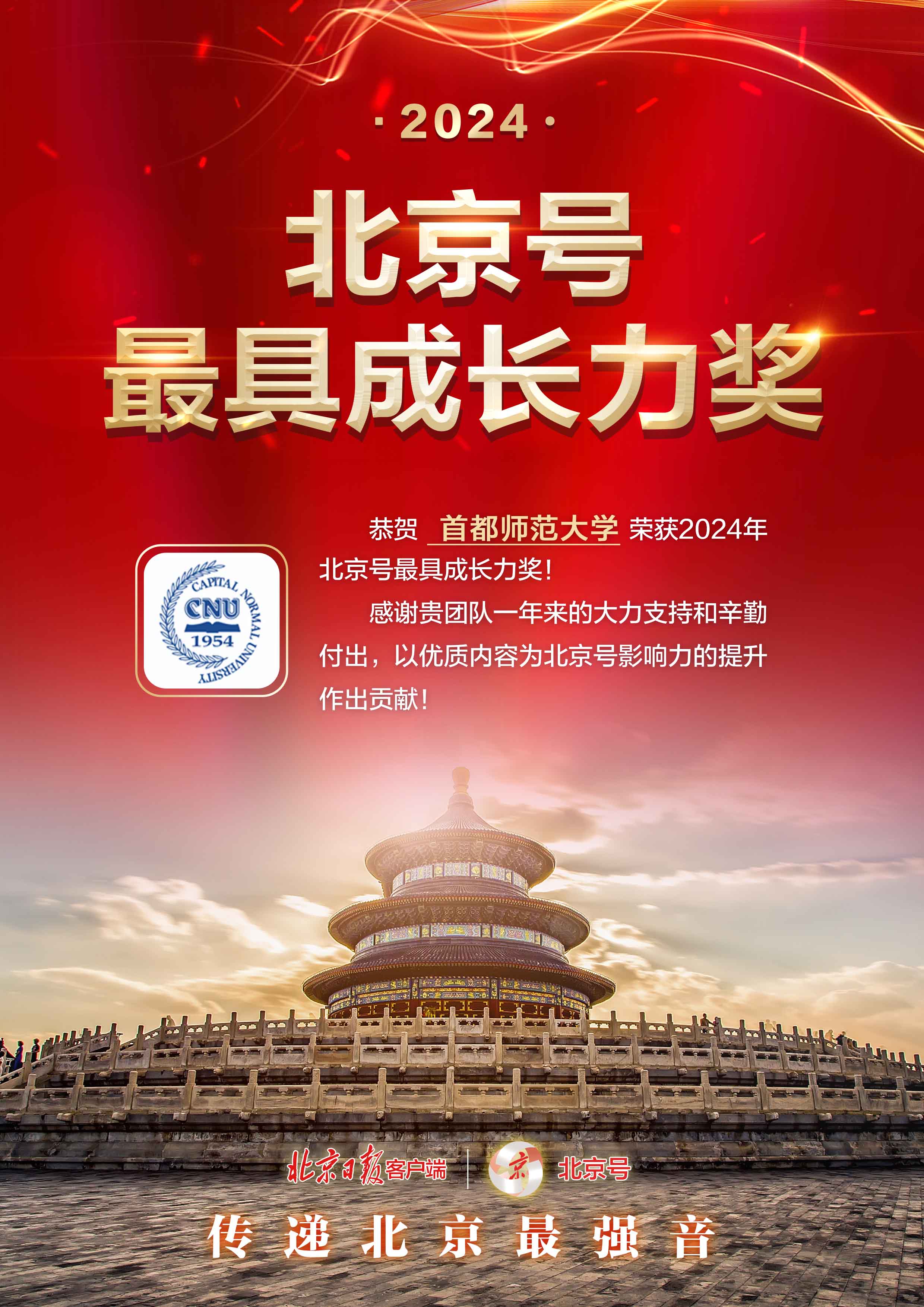 12月27日下午,北京日报客户端北京号2024年度影响力奖项正式发布,首都师范大学荣获2024年北京号最具成长力奖。该奖项以各单位全年阅读热度指数为主要依据,评选出最具影响力奖10个、最具传播力奖18个、最佳合作奖4个、最具成长力奖28个。
