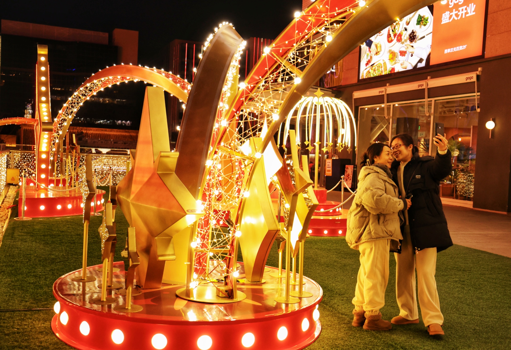 为迎接2025年新年的到来,西单商业街被各色彩灯装点得璀璨夺目、美轮美奂。多种迎新年景观装置点缀街头,为京城增添浓浓的新年气氛。