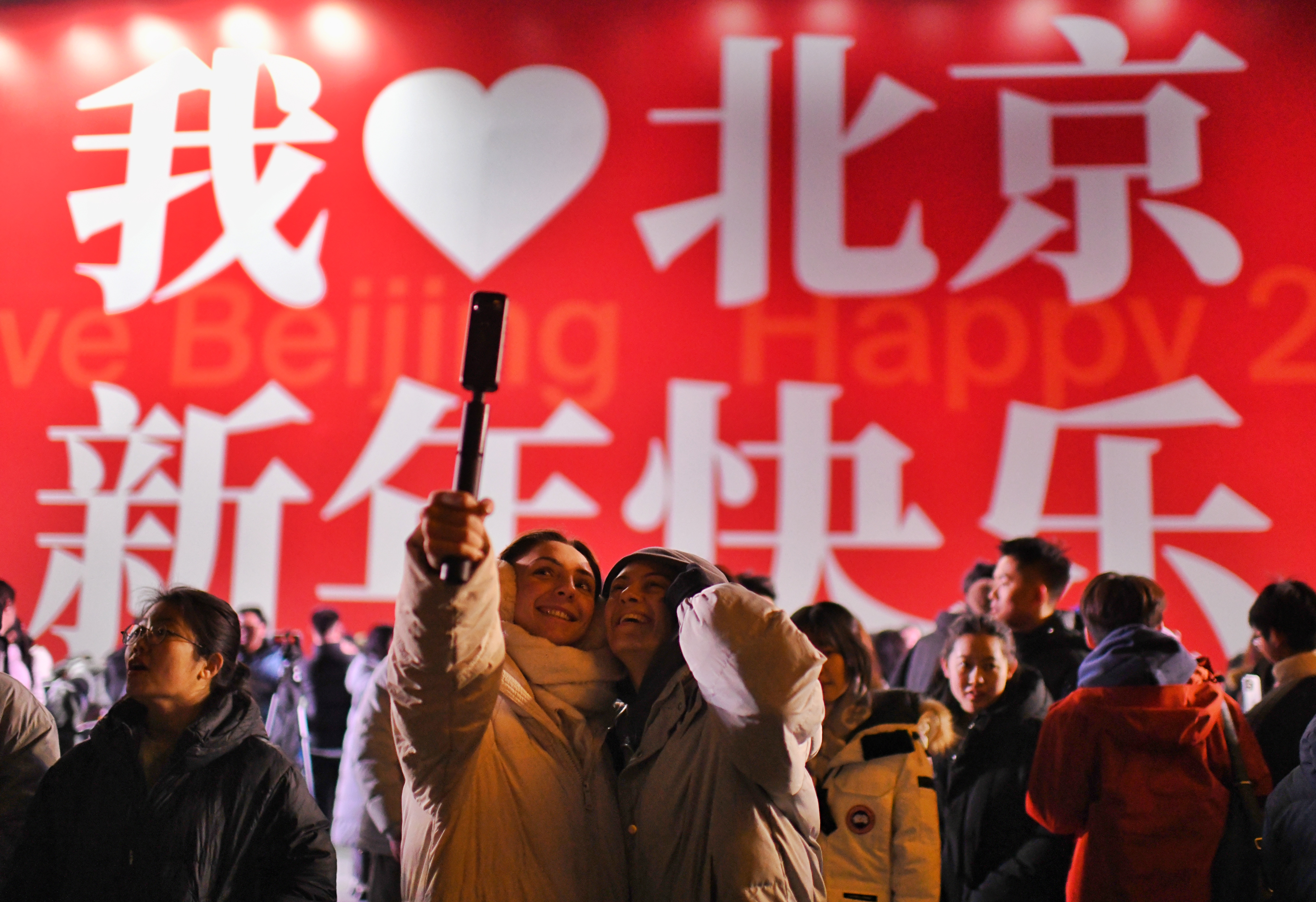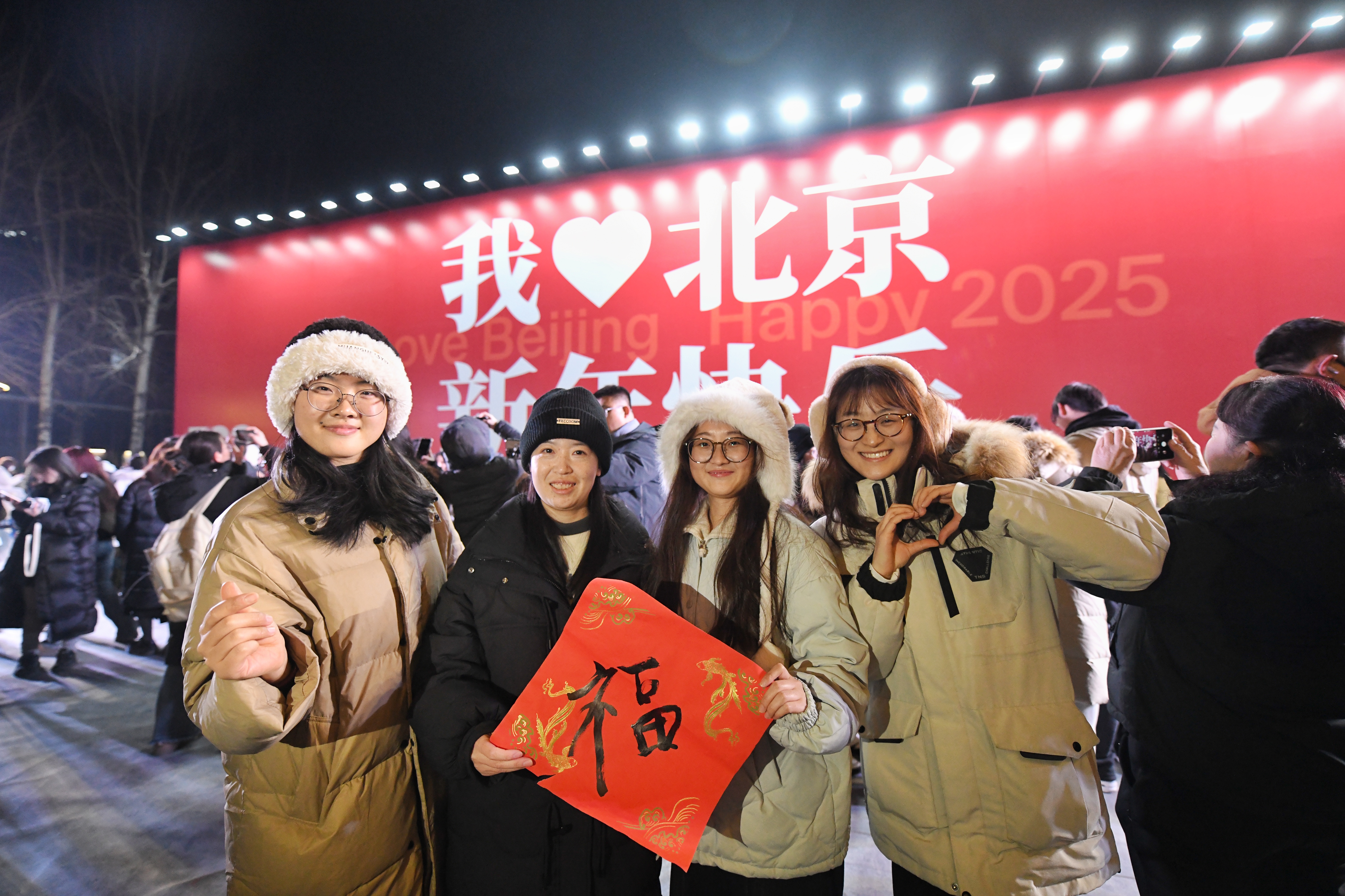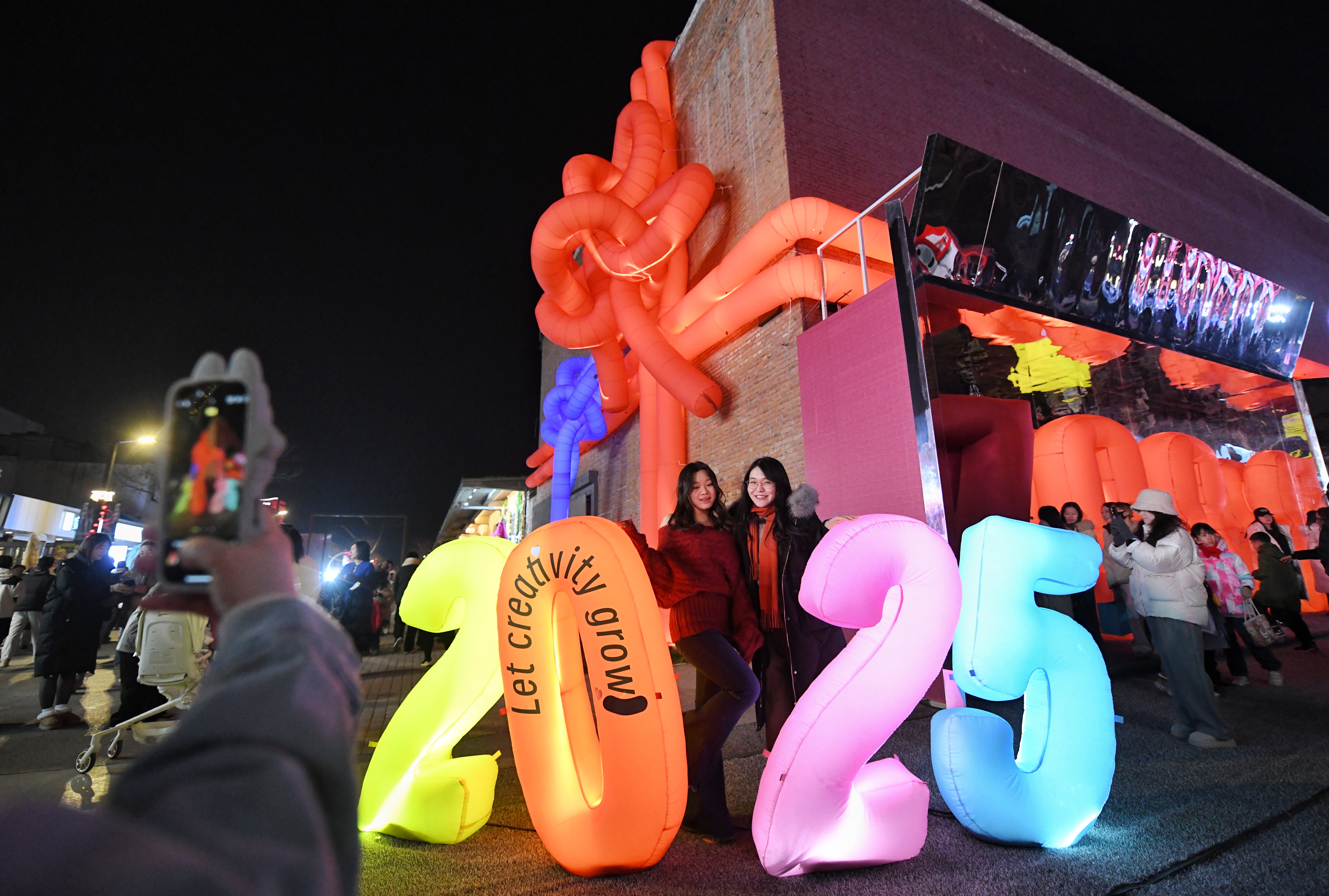 在798东街,备受瞩目的“巨型礼物盒”装置成为游客拍照留念的热门地标。红蓝绳结装点的“礼盒”象征团结与吉祥,同时也是798与751园区合并运营后紧密协作的象征。据悉,红蓝绳结还将纳入园区文创“结福新艺”新年礼盒,与更多游客见面。而另一端的电子广场上,巨幅标语“我爱北京,新年快乐”映得游人红光满面。明亮的字体与背景构成强烈的视觉冲击力,成为许多游客迎接新年的“首选背景墙”。