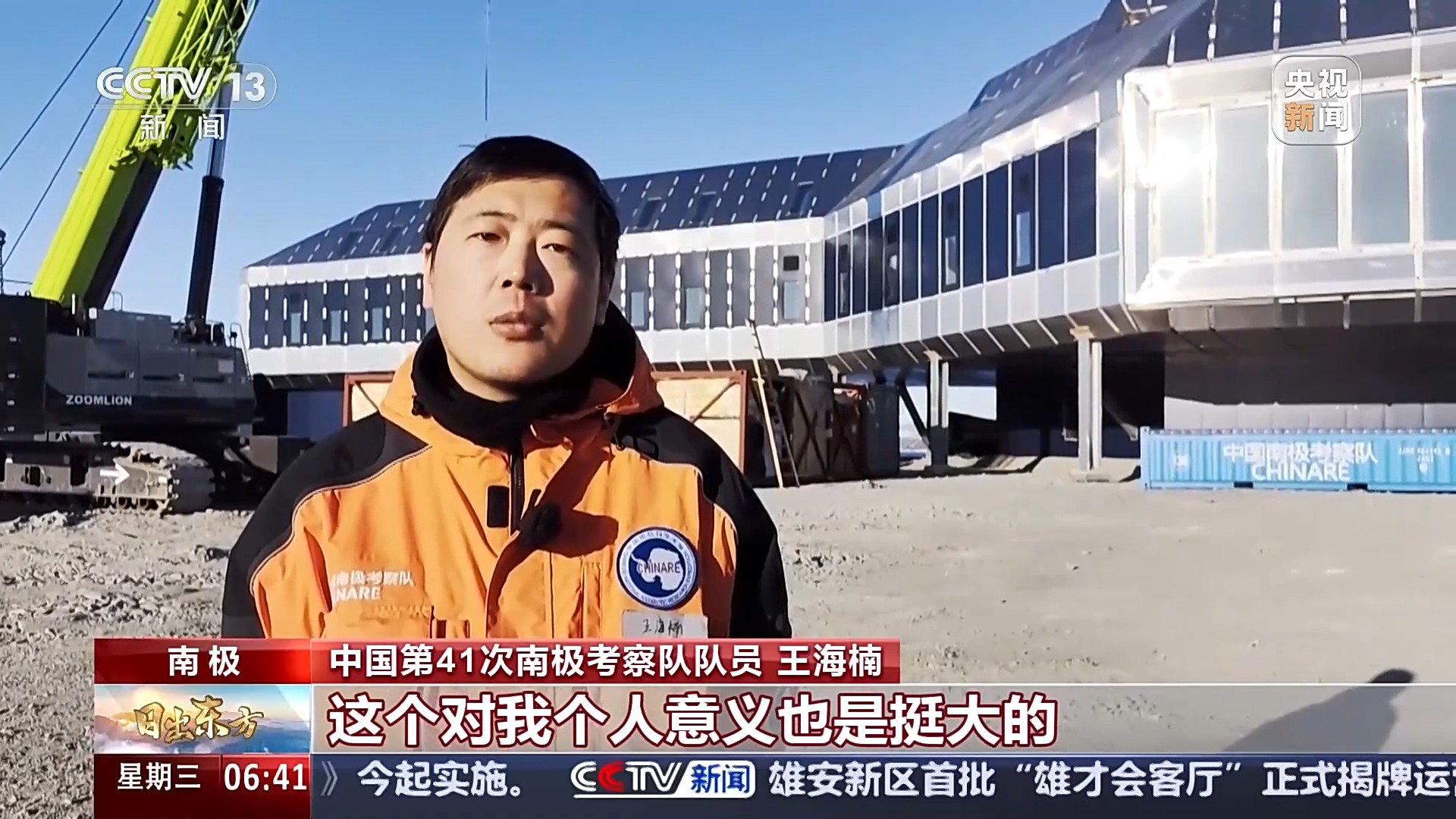 中国第41次南极考察队队员 王海楠:作为第一批的越冬人员,感到非常荣幸,可能有很多老前辈们,干了很多年,也赶不上一个考察站的首次越冬,这个对我个人意义也是挺大的。
