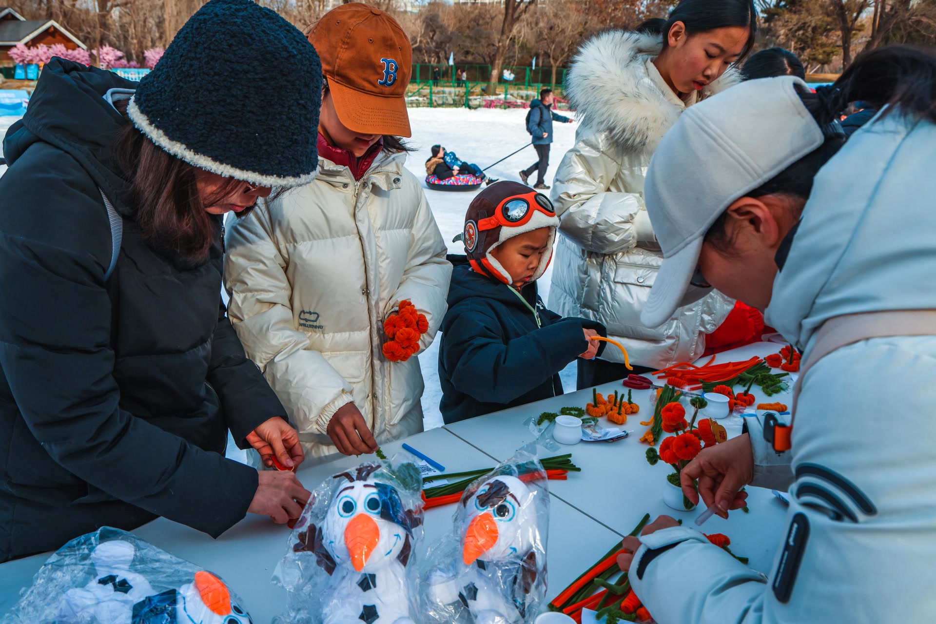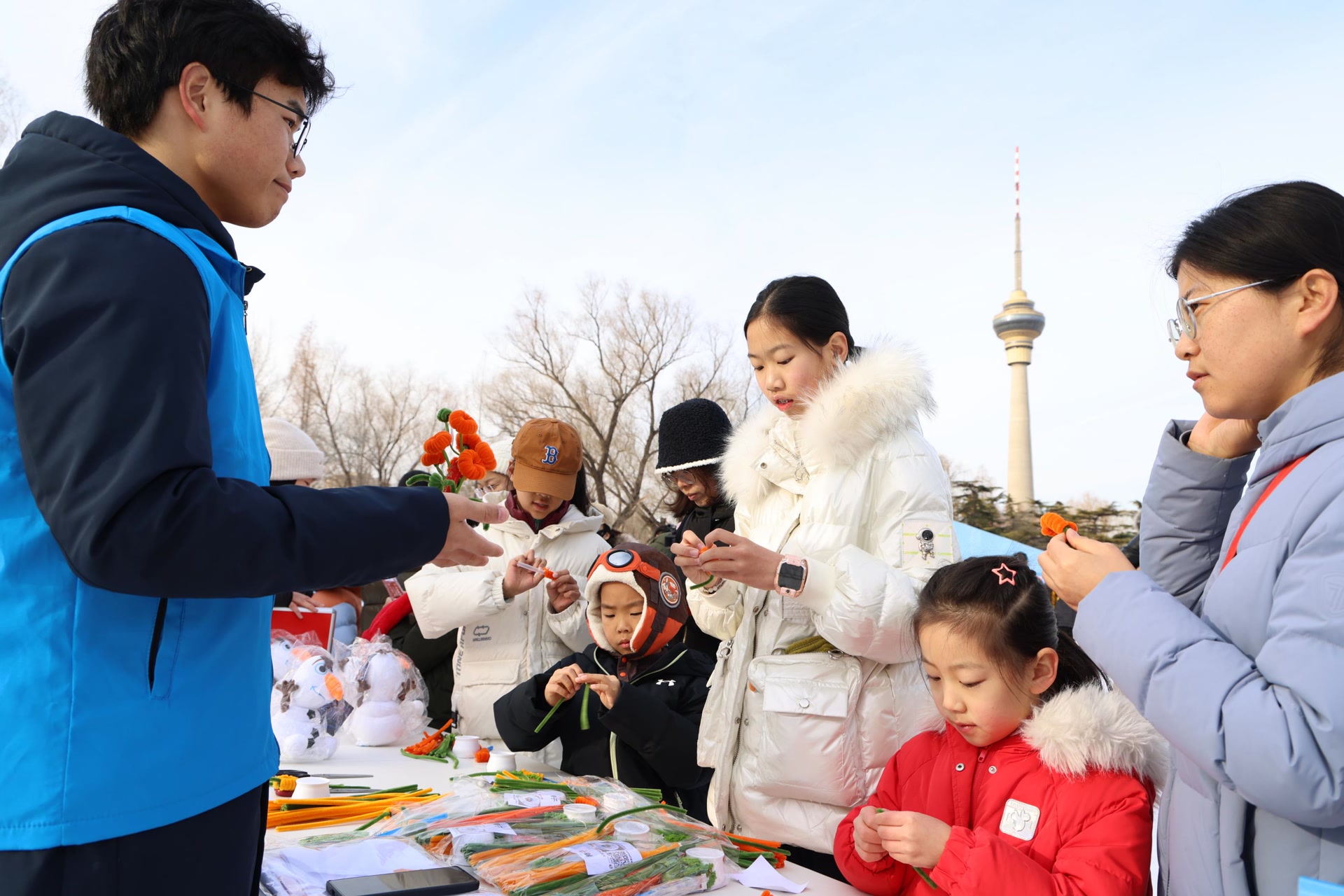 雪场另一侧的“好事发生 ”手工制作区域,孩子们在家长的协助下正专注地利用扭扭棒制作新年福桶,他们通过巧手将2025年的美好愿望编进福桶里,共同迎接新年的第一天。